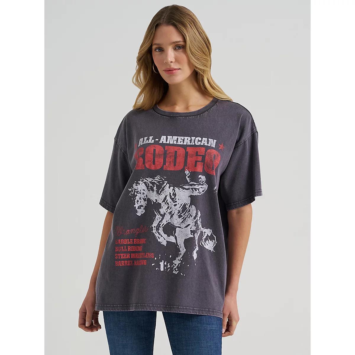 Celebrating the enduring spirit of rodeo, this oversized tee combines retro-inspired snapshots from some of our favorite rodeo events with a bit of rodeo history added in at the bottom of the back. It's cut loose and long with dropped shoulders for a lived-in look and feel. Nothing goes better with your Wrangler® denim than a classic crewnec