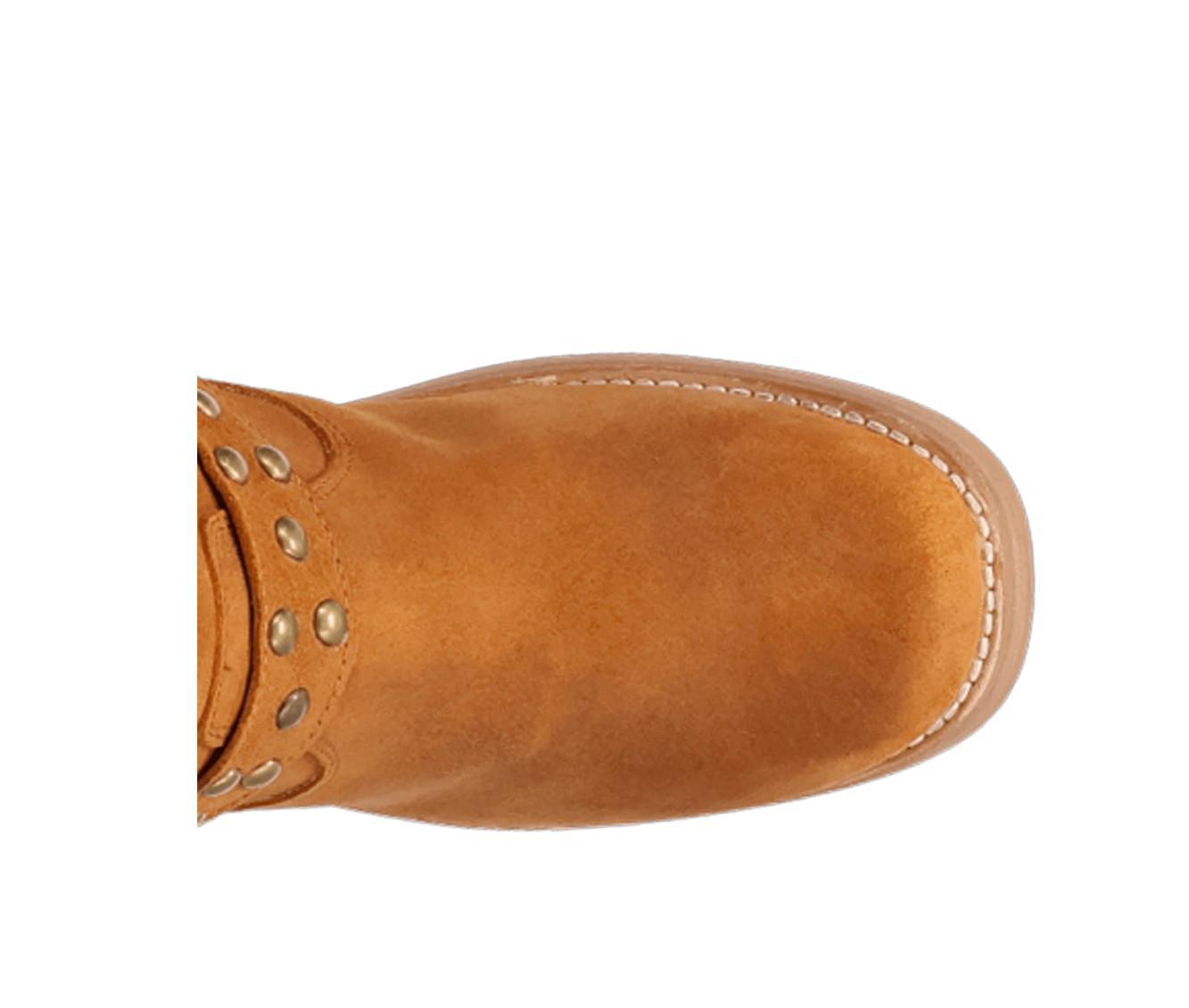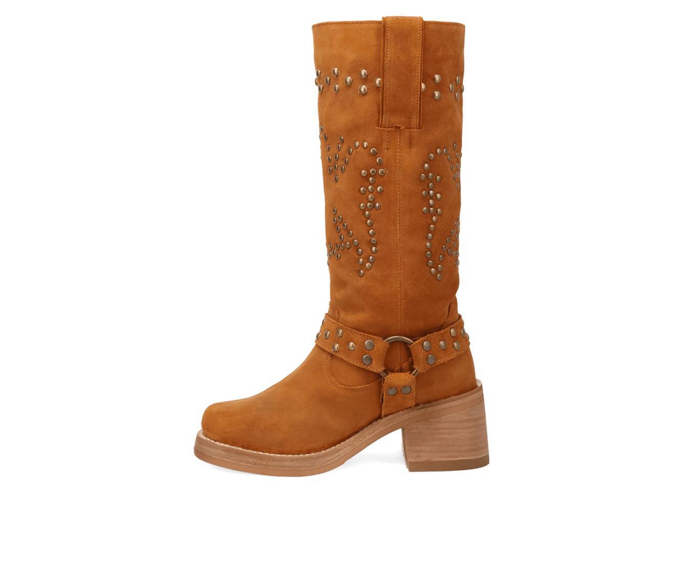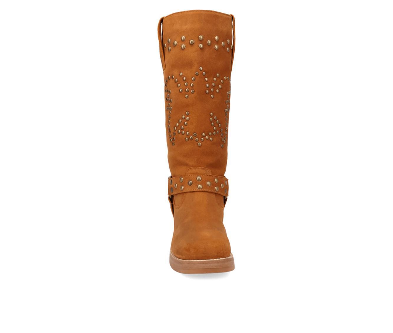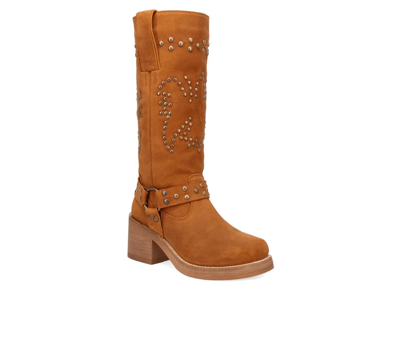 Western meets edgy in this tall boot detailed with metal studs and a wraparound harness strap. Crafted from a soft faux suede upper, it blends cowboy inspiration with bold attitude, anchored by a block heel and pull-on shaft for easy everyday wear.