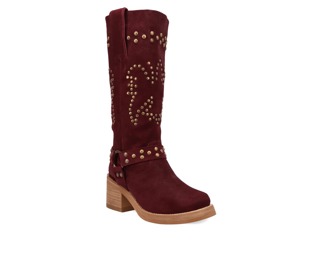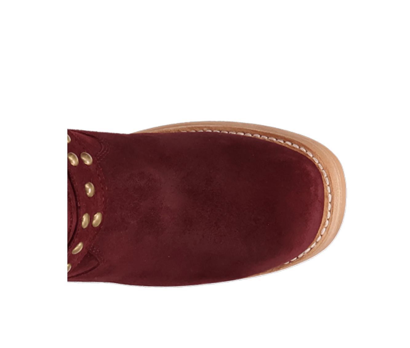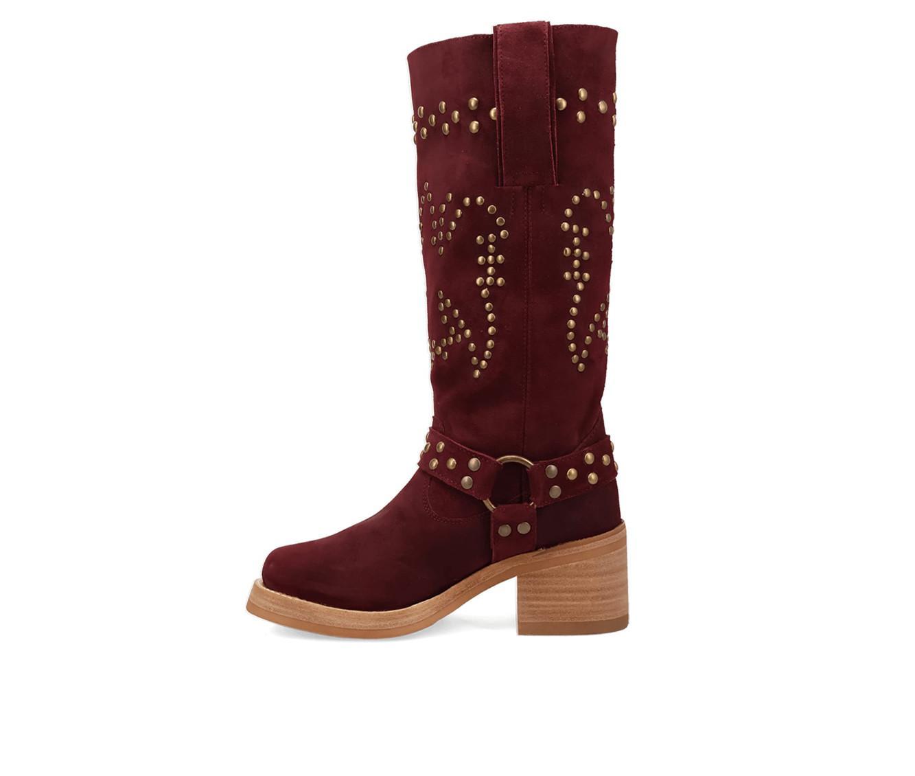 Western meets edgy in this tall boot detailed with metal studs and a wraparound harness strap. Crafted from a soft faux suede upper, it blends cowboy inspiration with bold attitude, anchored by a block heel and pull-on shaft for easy everyday wear.