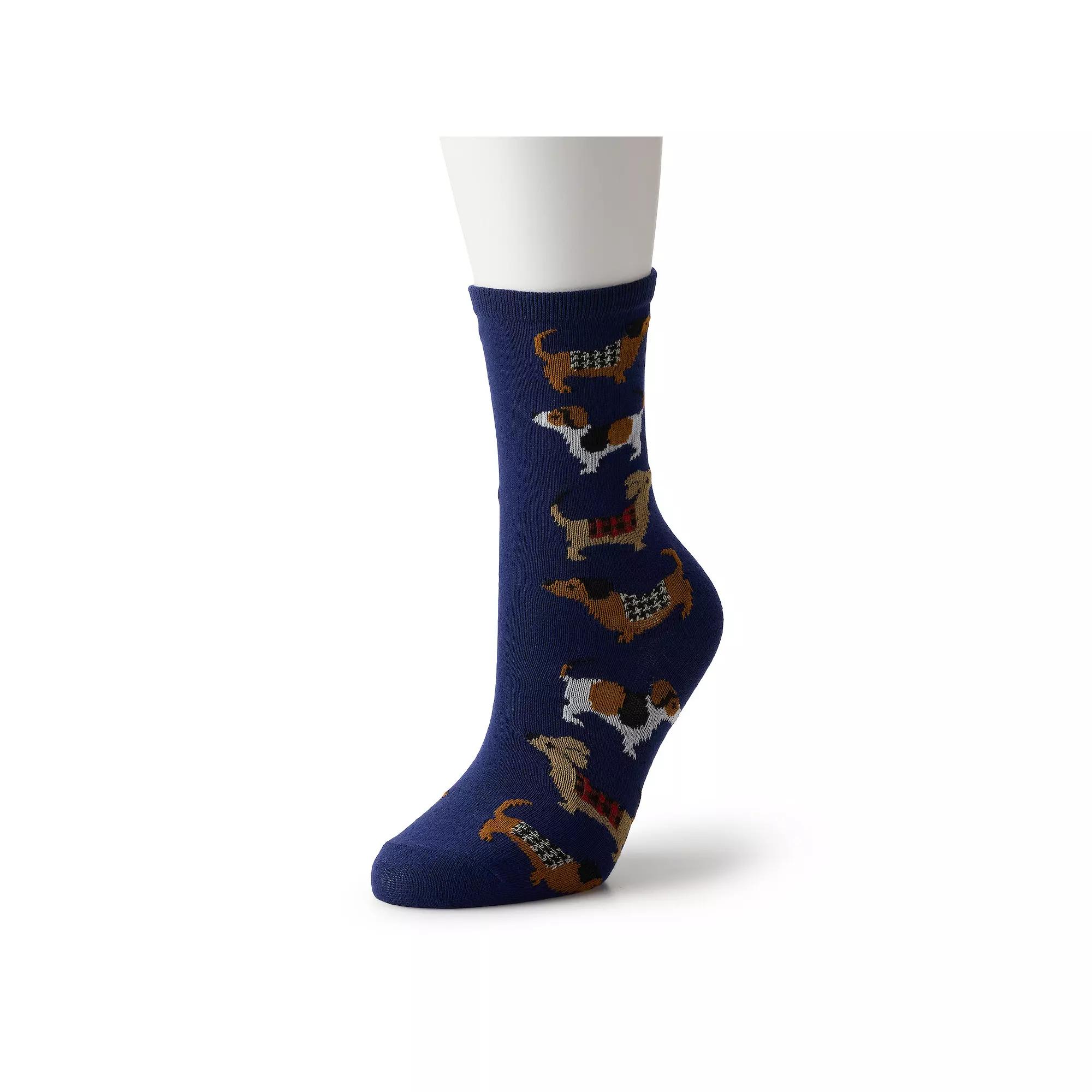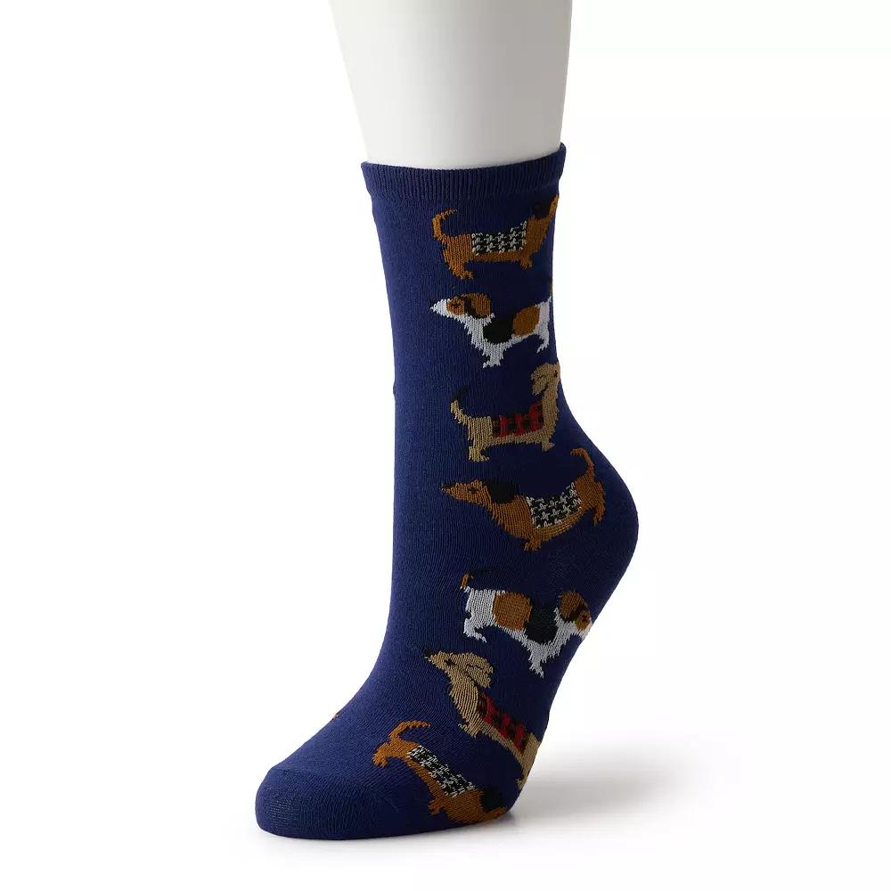 Step into comfort and charm with these delightful crew socks from the brand. Adorned with playful dog designs, they bring a touch of whimsy to your everyday outfit while providing the perfect fit for all-day wear. How do you accessorize? Check out our ACCESSORIES GUIDE for essential tips to elevate your style with must-have accessories. - https://www.kohls.com/feature/accessories-guide.jsp. FEATURES: Novelty crew sock design featuring playful dog patterns, Made with recycled polyester. FIT & SIZE: Sock size range: 9, 10, 11. DETAILS: Imported. MATERIAL & CARE: 58% polyester, 40% recycled polyester, 1% spandex, 1% rubber, Machine wash. RESPONSIBLE Contain recycled polyester. Size: 9-11. Color: Navy. Gender: female. Age Group: adult. Material: POLY BLEND.