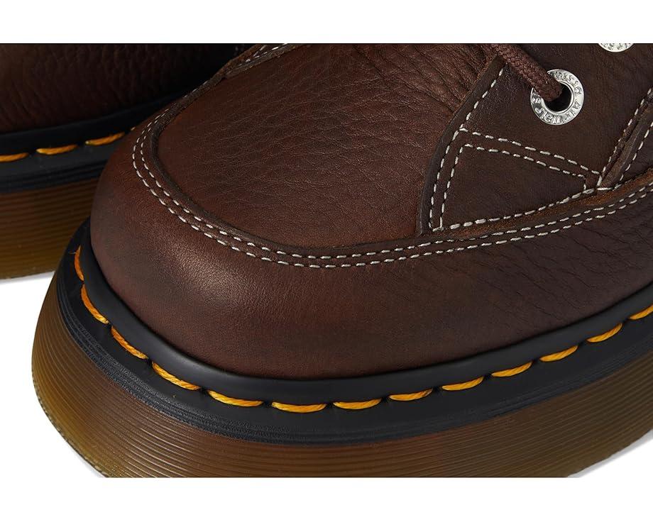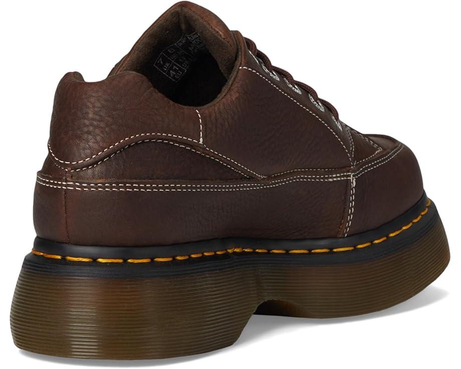 Inspired by a 90's silhouette, the Dr. Martens® Buzz 5-Eye shoes grab attention from top to bottom. They stand on a chunky barrel-edge Buzz PVC outsole that is marked with DM's grooving, yellow welt stitching, and a leaf pattern on the undersole. The soft-milled Nappa leather upper has a comfortable padded collar and an inflated, rubberized badge that echoes the contours of the sole. They also come with an alternative pair of fluffy black laces. These lace-up shoes are made of a leather insole and lining for added comfort while their Goodyear welted construction makes them a durable footwear choice.
