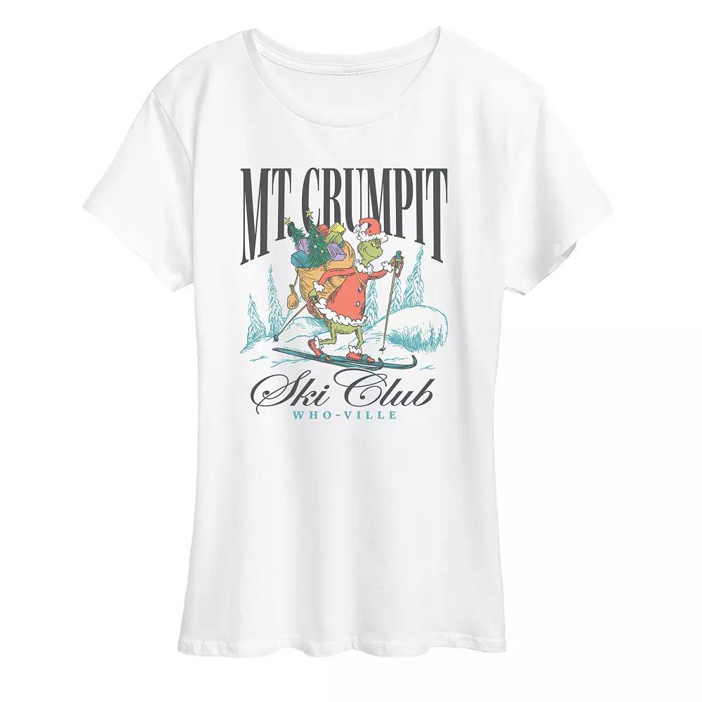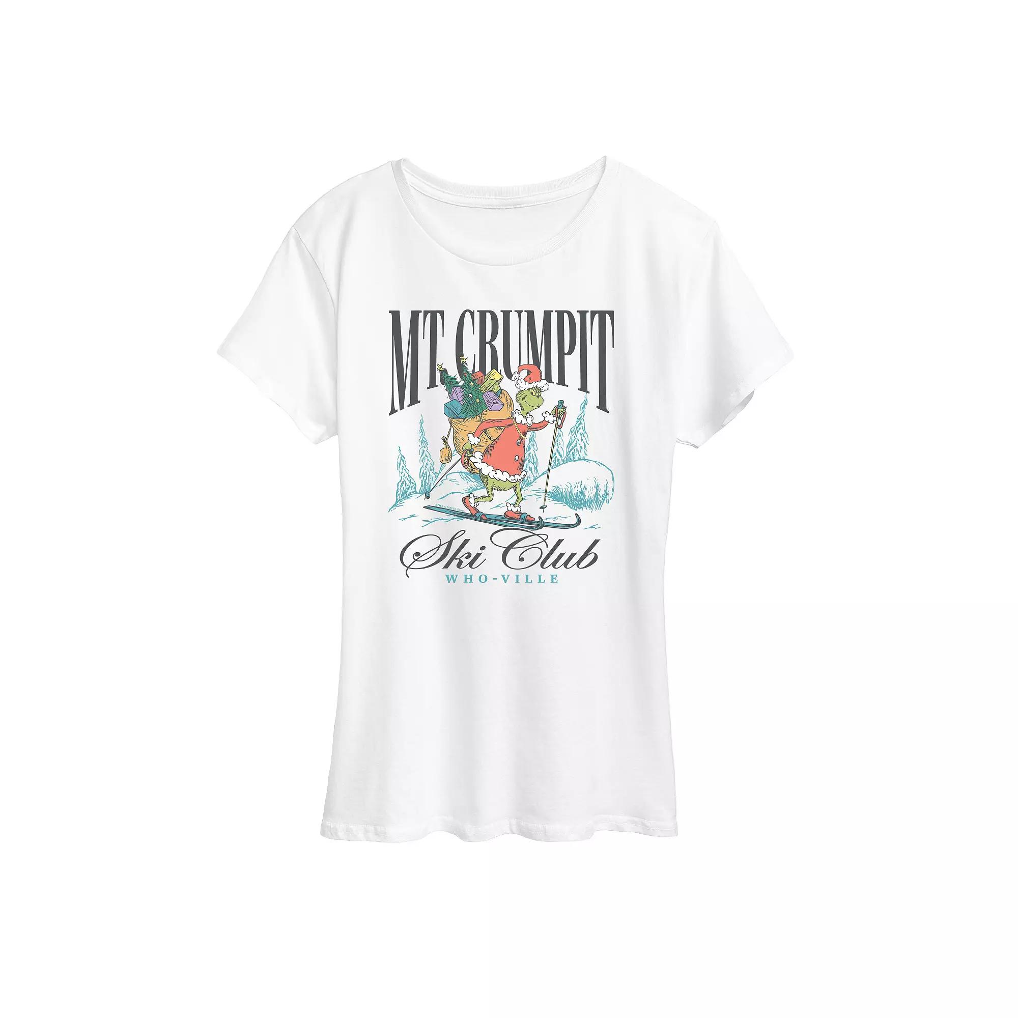 This playful graphic tee captures the whimsical spirit of the beloved Grinch and his snowy adventures at Mt. Crumpit Ski Club. Perfect for adding a touch of festive fun to any casual outfit, it's sure to become a favorite for holiday gatherings and everyday wear alike. Click on this WOMEN'S GUIDE to find the perfect fit and more! - https://www.kohls.com/feature/womens-fit-guide.jsp. FIT & SIZE: Women's Regular Size. DETAILS: Scoopneck, Short sleeves, Imported. MATERIAL & CARE: Solid colors: cotton, Heather colors: cotton/polyester blend, Machine wash. Size: Medium. Color: White. Gender: female. Age Group: adult.