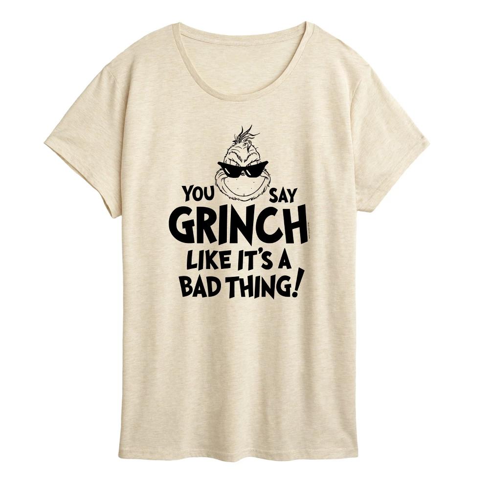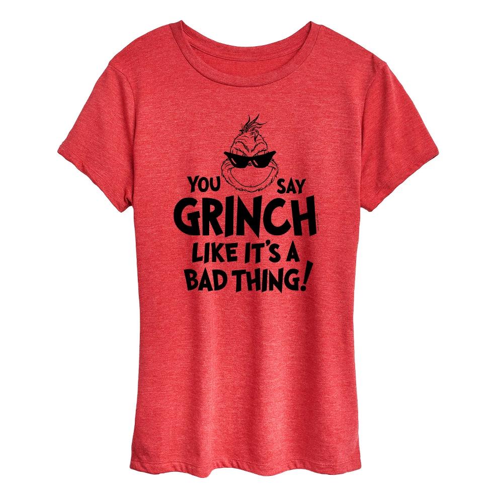 Dr. Seuss - The Grinch - You Say Grinch Bad Thing - Women's Short Sleeve Graphic T-Shirt - Our collection of graphic apparel featuring officially licensed Dr. Seuss characters brings the whimsy and wonder of Seussville straight into your wardrobe. From the mischievous Cat in the Hat to the stinky Grinch each design showcases iconic characters and scenes from Dr. Seuss's timeless stories.