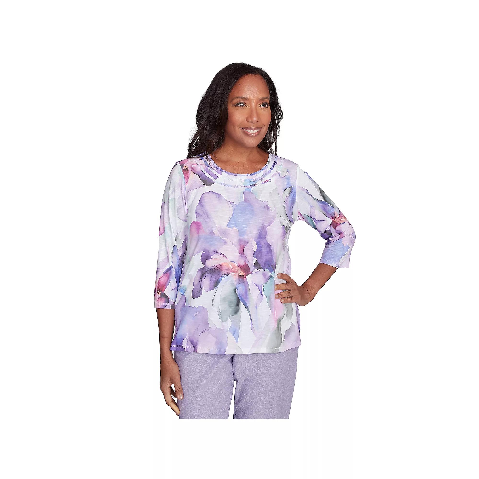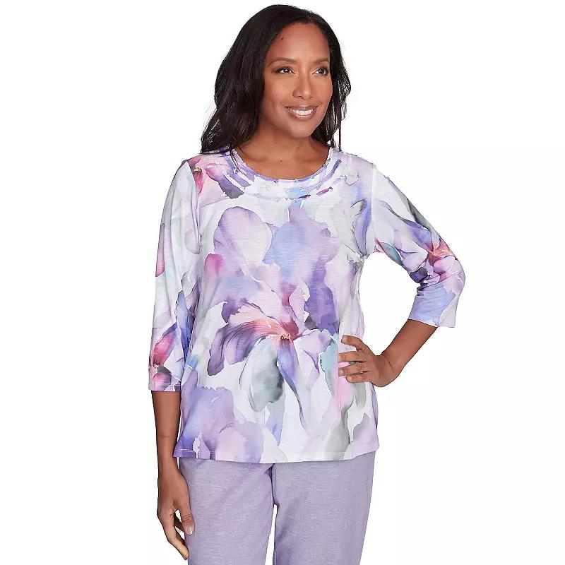 Brighten your wardrobe with this stunning floral top from the brand, designed to elevate your spring style. Featuring flattering neck detailing, three-quarter sleeves, and a straight hemline, this top pairs beautifully with jeans for a casual day out or tucked into a skirt for a more polished look, making it a versatile addition to any outfit.Click on this WOMENS GUIDE to find the perfect fit and more!Brighten your wardrobe with this stunning floral top from the brand, designed to elevate your spring style. Featuring flattering neck detailing, three-quarter sleeves, and a straight hemline, this top pairs beautifully with jeans for a casual day out or tucked into a skirt for a more polished look, making it a versatile addition to any outfit.Click on this WOMENS GUIDE to find the perfect fit and more!FEATURES No closure - pullover styling Crewneck 3/4-length sleevesFIT & SIZING 24 1/2-in. length from shoulder to hemFABRIC & CARE Polyester, spandex Machine wash and tumble dry Imported Size: Small. Color: Lilac Team. Gender: female. Age Group: adult.