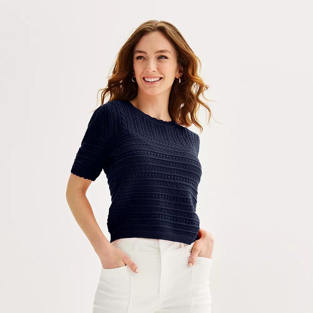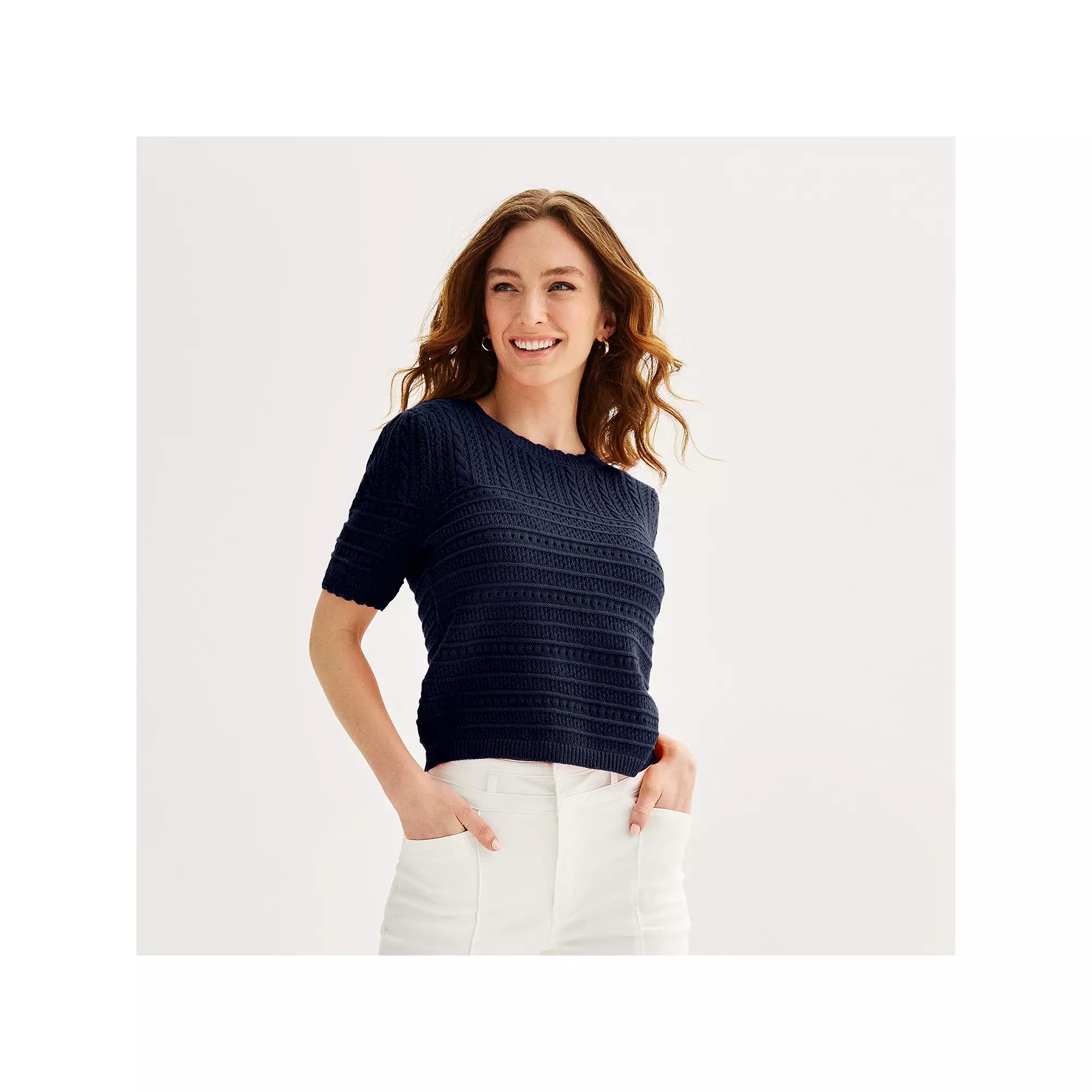Upgrade your wardrobe with this short sleeve pointelle sweater by DRAPER JAMES RSVP.Click on this WOMEN'S GUIDE to find the perfect fit and more! Upgrade your wardrobe with this short sleeve pointelle sweater by Draper James.Click on this WOMEN'S GUIDE to find the perfect fit and more! FEATURES Crewneck Short sleeves Scalloped neckline and cuffs Unlined Pointelle constructionFIT & SIZING 21-in. length from shoulder to hemFABRIC & CARE Cotton, acrylic, nylon Machine wash delicate Imported Size: Large. Color: Navy. Gender: female. Age Group: adult.