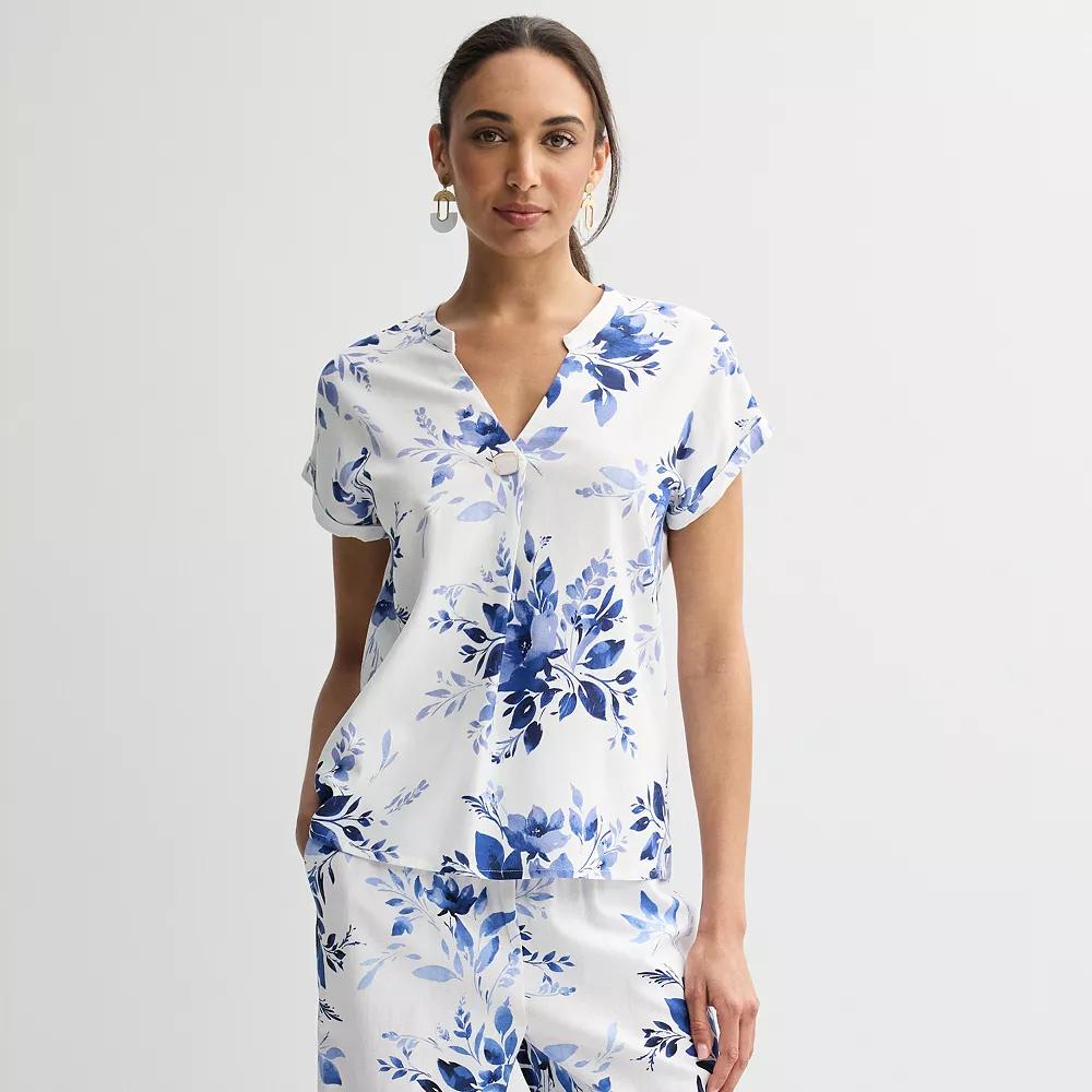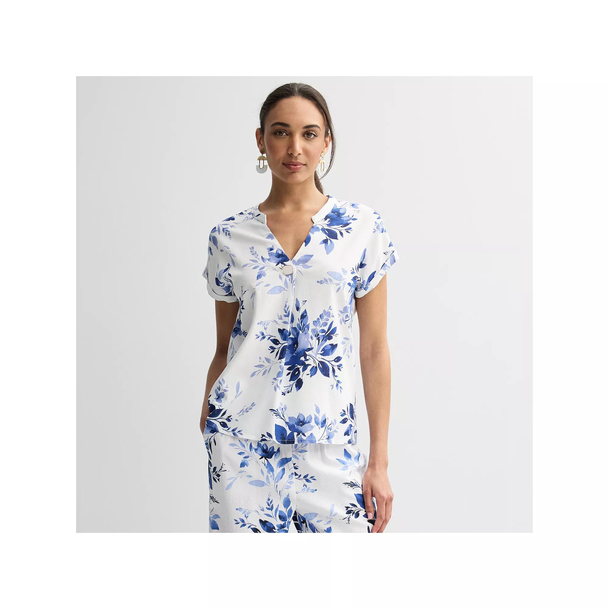 Express your unique style with this womens Ellen Tracy linen faux pearl button drop sleeve top. Click on this WOMENS GUIDE to find the perfect fit and more!Express your unique style with this womens Ellen Tracy linen faux pearl button drop sleeve top. Click on this WOMENS GUIDE to find the perfect fit and more!FEATURES V-neck Short sleeves Drop-shoulder sleeves Rounded cuffs Pullover stylingFIT & SIZING Flowy fit 25 1/4-in. from shoulder to hemFABRIC & CARE Viscose, linen Machine wash and tumble dry low Imported Size: Medium. Color: Floral Bloom. Gender: female. Age Group: adult.