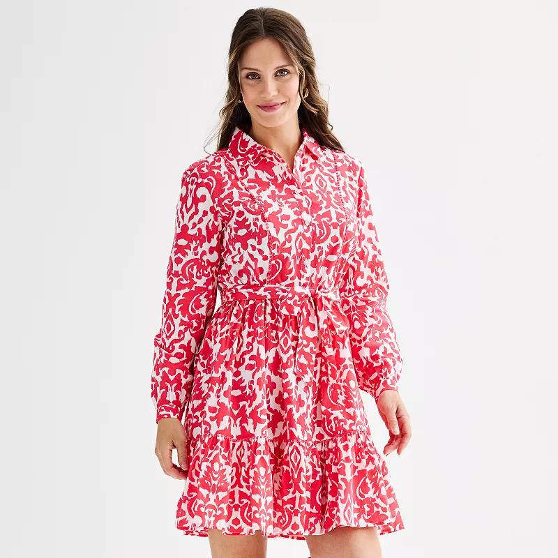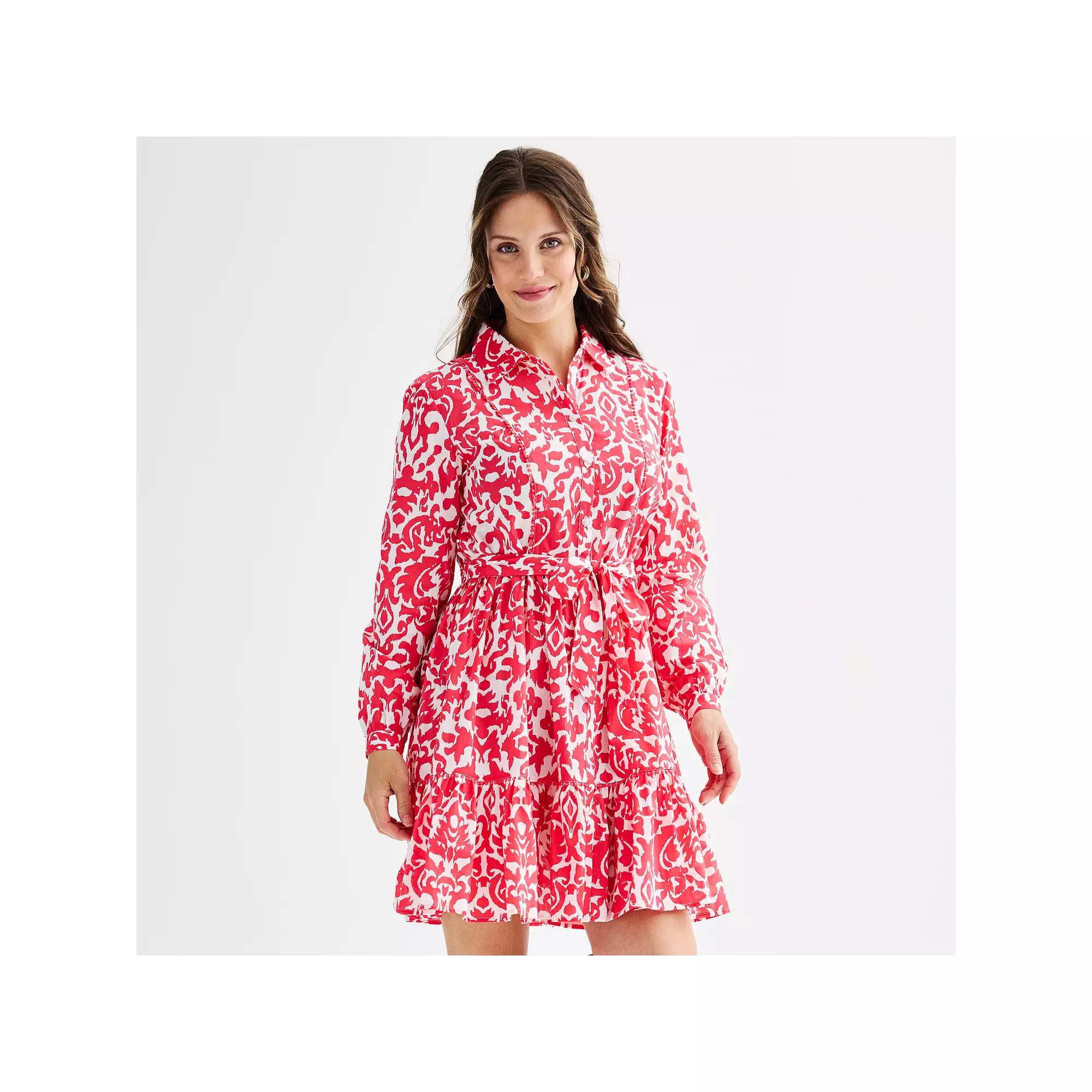 This womens Ellen Tracy shirt dress with self tie and ruffle hem is easily dressed up or down. Pairs well with sneakers, sandals, or heels.Click on this WOMENS GUIDE to find the perfect fit and more! This womens Ellen Tracy shirt dress with self tie and ruffle hem is easily dressed up or down. Pairs well with sneakers, sandals, or heels.Click on this WOMENS GUIDE to find the perfect fit and more! FEATURES Shirtdress Ruffled hem Button closure Barrel cuffs Balloon sleeves Long sleeves Front-tie sash Collared necklineFIT & SIZING Relaxed 38-in. length from shoulder to hem Mini length hits at the thighFABRIC & CARE Cotton Machine wash Imported Size: X Small. Color: Geranium Damask. Gender: female. Age Group: adult.