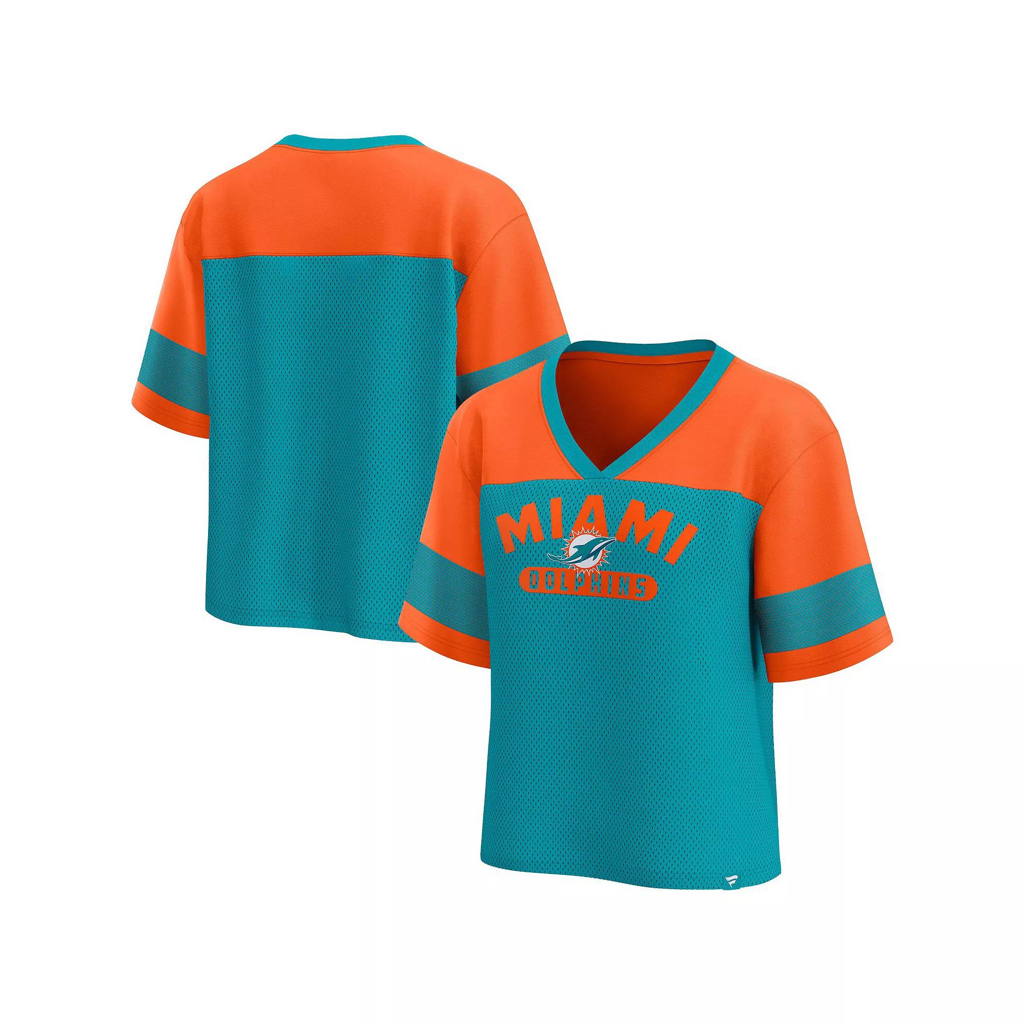 Look and feel like you're part of the team with this Miami Dolphins Homeschool Jersey Poly V-Neck Fashion Top from Fanatics. This stylish top boasts a unique design, featuring a contrast color mesh panel sewn onto the sleeves for a sporty look. The screen-printed team name and logo across the front make it clear you're a dedicated Miami Dolphins fan.Look and feel like you're part of the team with this Miami Dolphins Homeschool Jersey Poly V-Neck Fashion Top from Fanatics. This stylish top boasts a unique design, featuring a contrast color mesh panel sewn onto the sleeves for a sporty look. The screen-printed team name and logo across the front make it clear you're a dedicated Miami Dolphins fan.PRODUCT FEATURESOfficially licensedShort sleeveImportedV-neckScreen print team name and logo across the frontMachine wash, tumble dry lowFront and back yoke seamsMaterial: 50% Cotton/50% PolyesterBrand: FanaticsContrast-color mesh panel sewn onto sleevesDropped shoulder seams Size: XL. Color: Turq A. Gender: female. Age Group: adult.