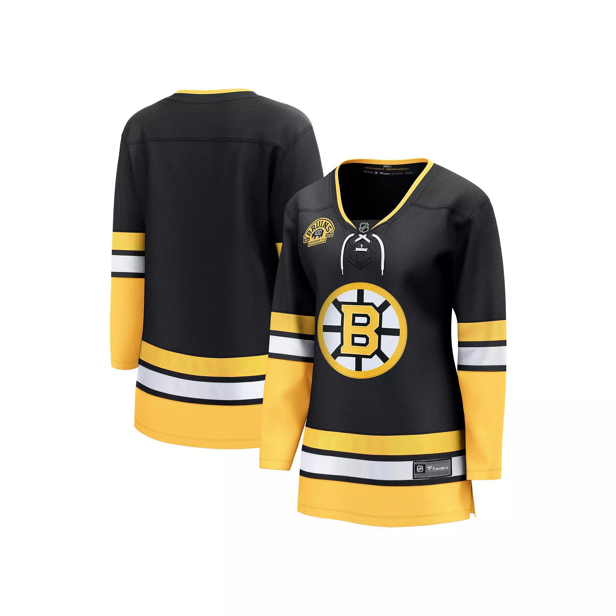 Celebrate 100 years of Boston Bruins hockey with this 100th Anniversary Premier Breakaway Jersey. This jersey features a 100th anniversary patch on the shoulder along with a throwback Bruins logo on the chest. With a tailored, midweight fabric that provides comfort and range of motion, there's no better way to celebrate your team's history than this stylish jersey.Celebrate 100 years of Boston Bruins hockey with this 100th Anniversary Premier Breakaway Jersey. This jersey features a 100th anniversary patch on the shoulder along with a throwback Bruins logo on the chest. With a tailored, midweight fabric that provides comfort and range of motion, there's no better way to celebrate your team's history than this stylish jersey.PRODUCT FEATURESOfficially licensedFanatics BreakawayFanTex: Performance midweight fabric that has the optimal drape and range of motionFanShield: Moisture management technology keeps you cool, dry and comfortableMaterial: 100% PolyesterHeat-pressed twill applique graphicsCollar fabric insert with heat-sealed NHL ShieldLong sleeveWoven jock tagRounded droptail hem with side ventsFanFit: A more tailored fit providing improved comfort around the torso and armsFanFlex: Revolutionary trims that are foldable, lightweight and machine washableJersey Color Style: AlternateImportedBack neck tapingBrand: FanaticsMachine wash, tumble dry low Size: 2X. Color: Black. Gender: female. Age Group: adult.
