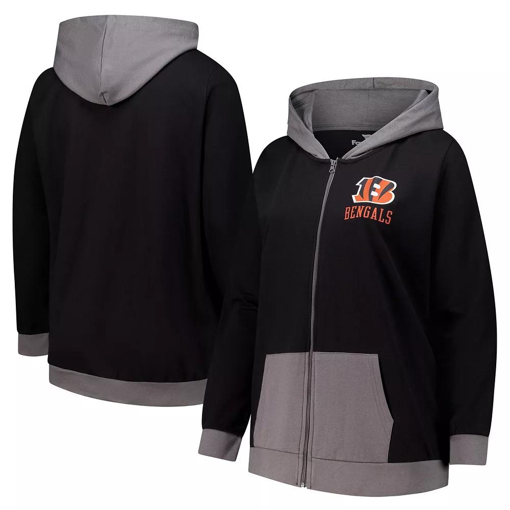 Stay comfy while representing your Cincinnati Bengals in this Hit It Full-Zip Hoodie by Fanatics. Made from a blend of soft French terry cotton and durable polyester, it features a contrast-color hood and front pockets for added warmth and convenience. Whether you're cheering from the stands or braving cooler weather, this Cincinnati Bengals hoodie is an ideal choice for keeping comfortable.Stay comfy while representing your Cincinnati Bengals in this Hit It Full-Zip Hoodie by Fanatics. Made from a blend of soft French terry cotton and durable polyester, it features a contrast-color hood and front pockets for added warmth and convenience. Whether you're cheering from the stands or braving cooler weather, this Cincinnati Bengals hoodie is an ideal choice for keeping comfortable.PRODUCT FEATURESHoodedImportedOfficially licensedScreen print team logo and wordmark on frontMachine wash, tumble dry lowMaterial: 60% Cotton/40% PolyesterLong sleeveFrench terry hood and two front pockets provide a soft feelFull ZipBrand: FanaticsMidweight hoodie suitable for moderate temperatures Size: 1X. Color: Black. Gender: female. Age Group: adult.