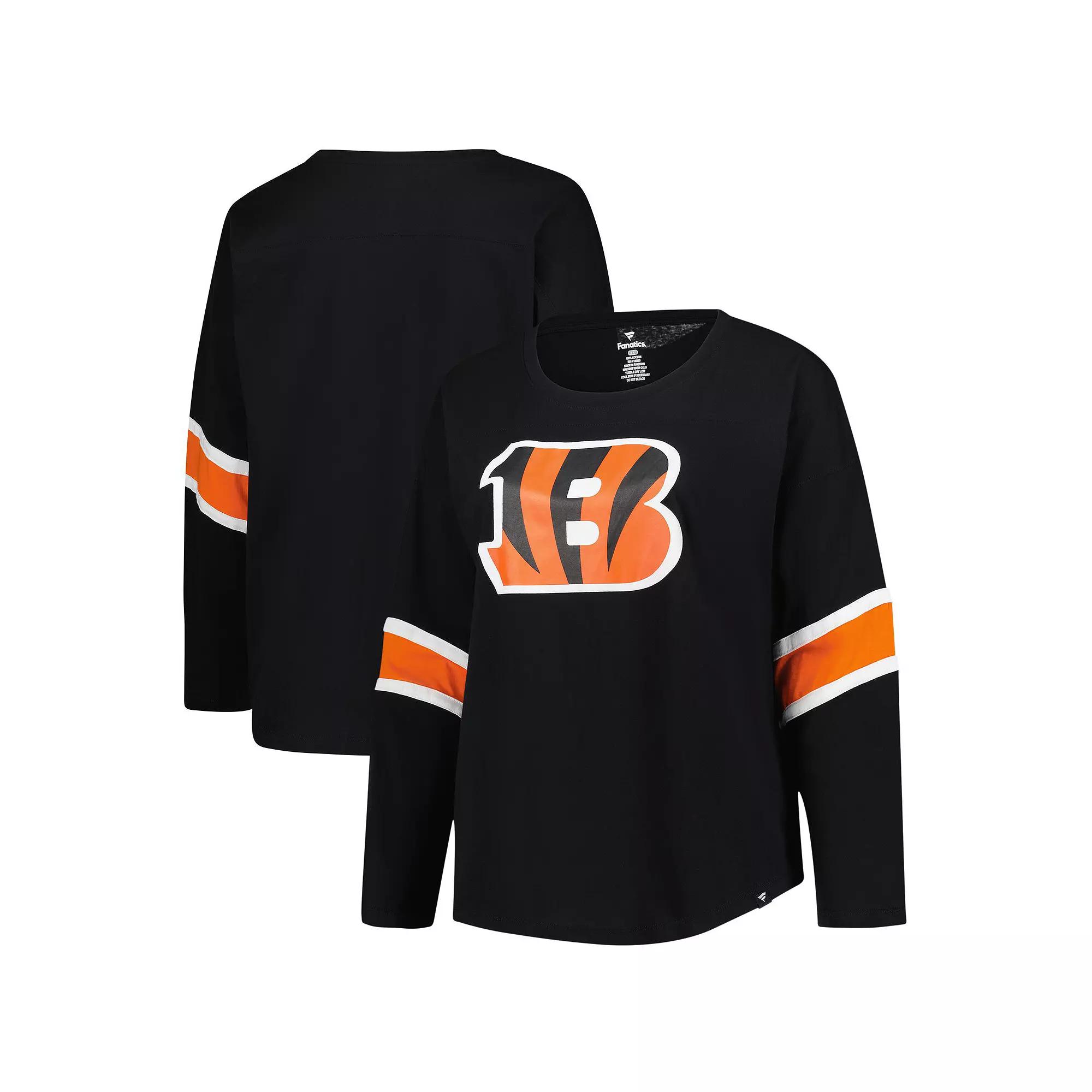Declare your unwavering allegiance to the Cincinnati Bengals with this stylish and comfortable Plus Size Redzone 3/4-Sleeve Scoop Neck T-Shirt from Fanatics. Featuring a relaxed fit and classic hip length, this tee ensures a comfortable and flattering look for any fan. The lightweight jersey fabric and dropped shoulder seams provide ease of movement, perfect for cheering on the team from the stands or relaxing at home. The heat-sealed silicone Cincinnati Bengals logo has a smooth, rubberized finish designed to stretch without cracking, ensuring long-lasting quality. Machine wash, tumble dry low. 3/4 Length sleeve. Dropped shoulder seams provide ease of movement. Low Hip Length (Measures approx. 30). Relaxed Fit: Loose and roomy across the chest, shoulders and body. Front and back yoke seams. Sewn-on sleeve stripes. Officially licensed. Brand: Fanatics. Rounded droptail hem. Imported. Jersey fabric has a lightweight feel (150gsm). Material: 100% Cotton. Screen print logo on front. Scoop neck. Woven clip tag at bottom left hem. Size: 2X. Color: Black. Gender: female. Age Group: adult.