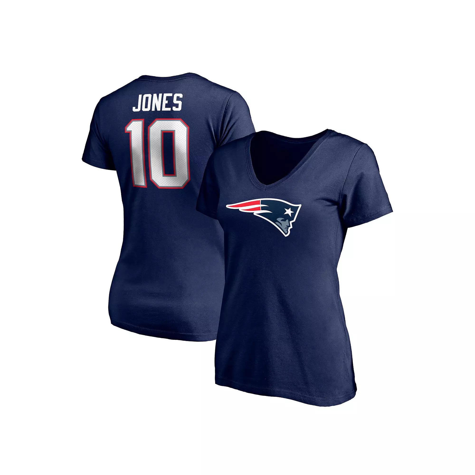 This Mac Jones Icon Name and Number T-shirt shows everyone which New England Patriots player has your support. It features the team logo across the chest and Mac Jones graphics with faux mesh details on the back for a jersey-inspired design. The ultra-soft material also gives this V-neck tee a lightweight, comfortable feel.This Mac Jones Icon Name and Number T-shirt shows everyone which New England Patriots player has your support. It features the team logo across the chest and Mac Jones graphics with faux mesh details on the back for a jersey-inspired design. The ultra-soft material also gives this V-neck tee a lightweight, comfortable feel.PRODUCT FEATURESBrand: Fanatics BrandedImportedMachine wash with garment inside out, tumble dry lowMaterial: 100% CottonOfficially licensedScreen print graphics with faux mesh detailShort sleeveTagless CollarV-neck Color: Navy. Gender: female. Age Group: adult.