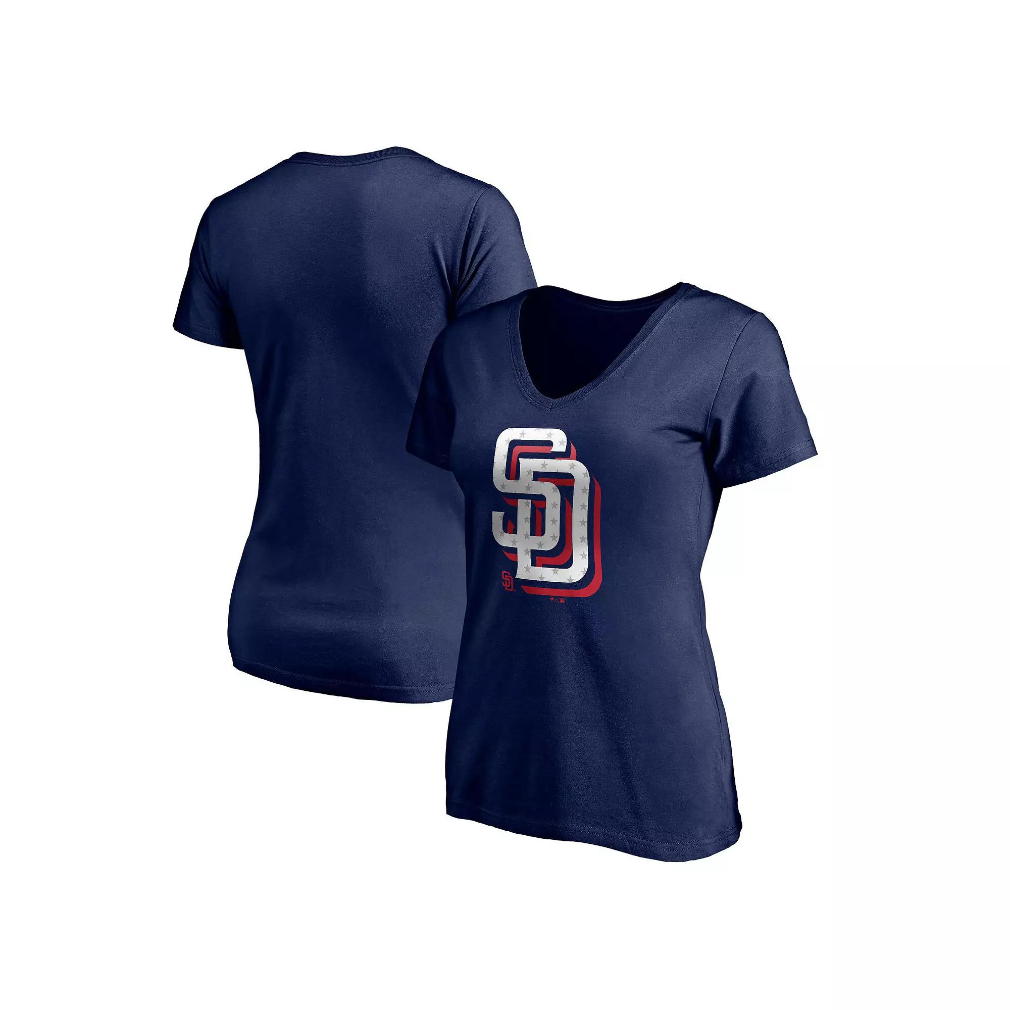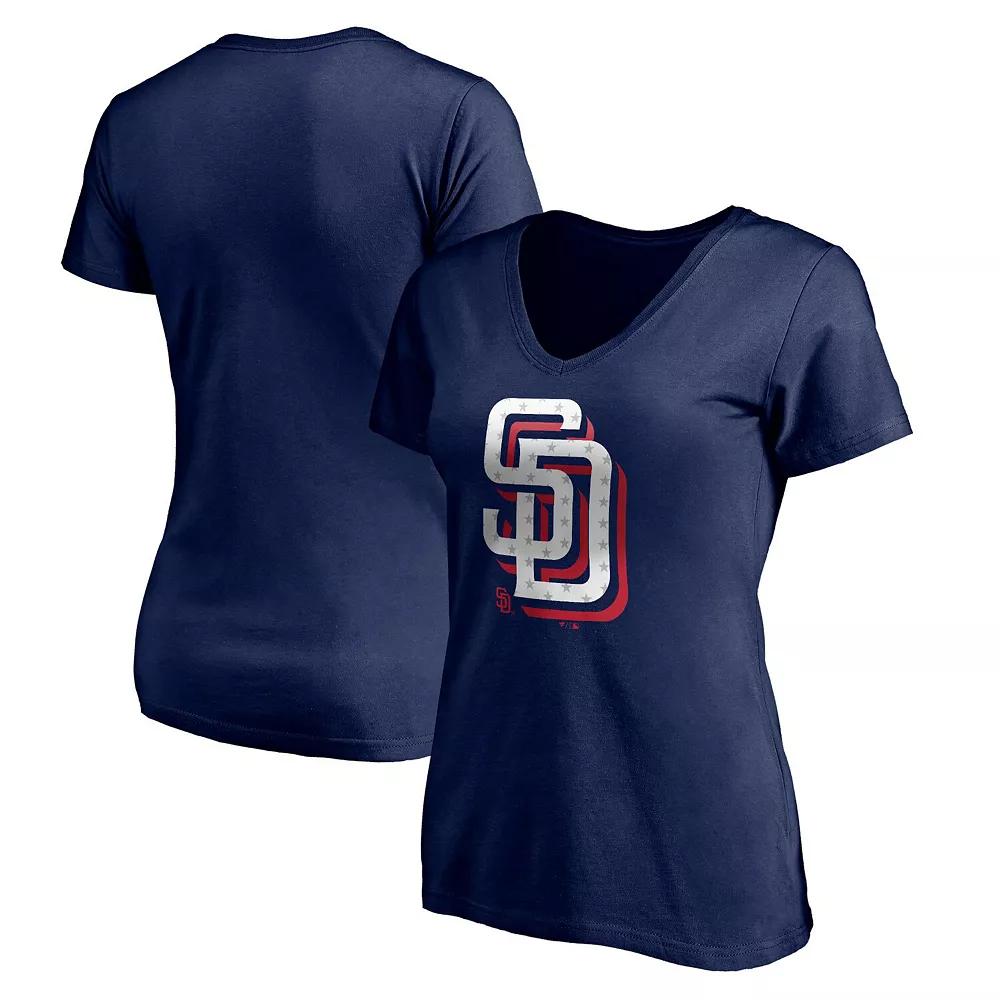 Take a patriotic approach to cheering on the San Diego Padres with this Red White and Team V-neck T-shirt. This Fanatics Branded T-shirt features a classic design and a unique take on the team's logo. Leave no question about team loyalty with this striking San Diego Padres T-shirt. Short sleeve. Screen print graphics. Machine wash. V-neck. Imported. Material: 100% Cotton. Brand: Fanatics Branded. Officially licensed. Color: Navy. Gender: female. Age Group: adult.