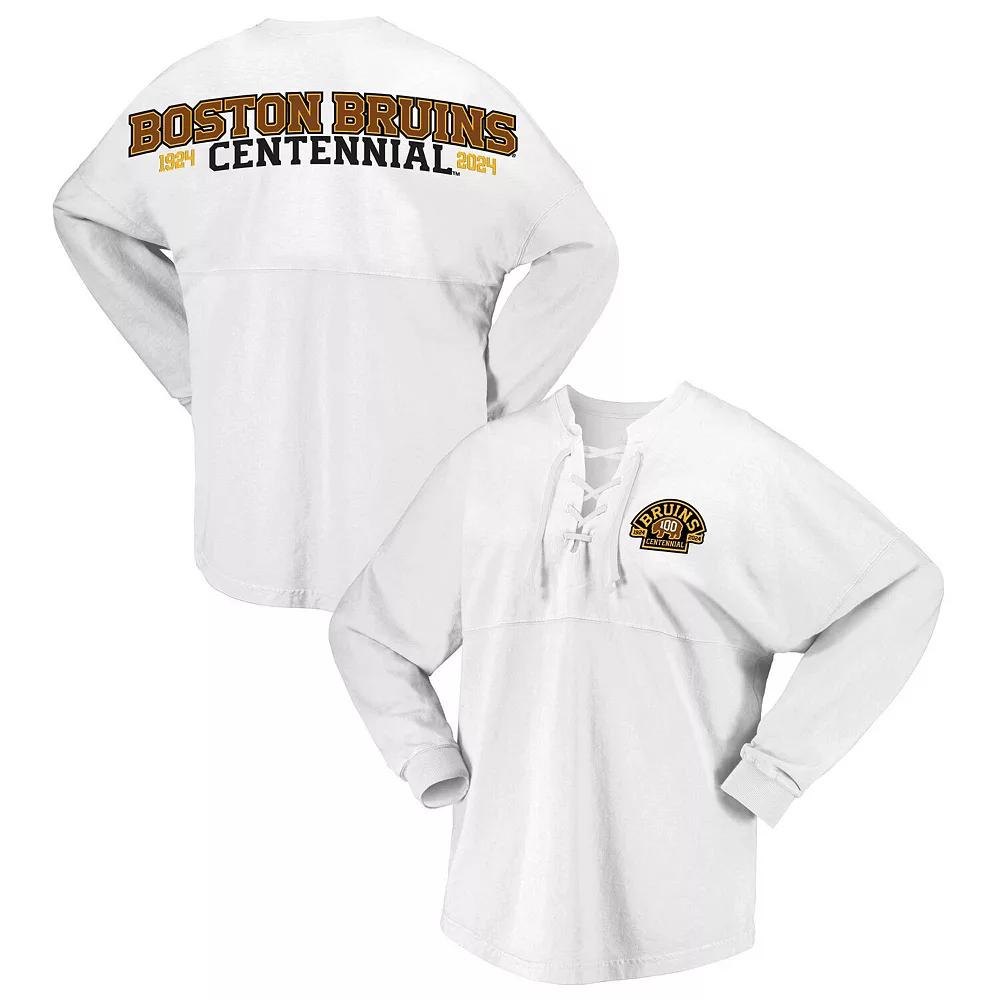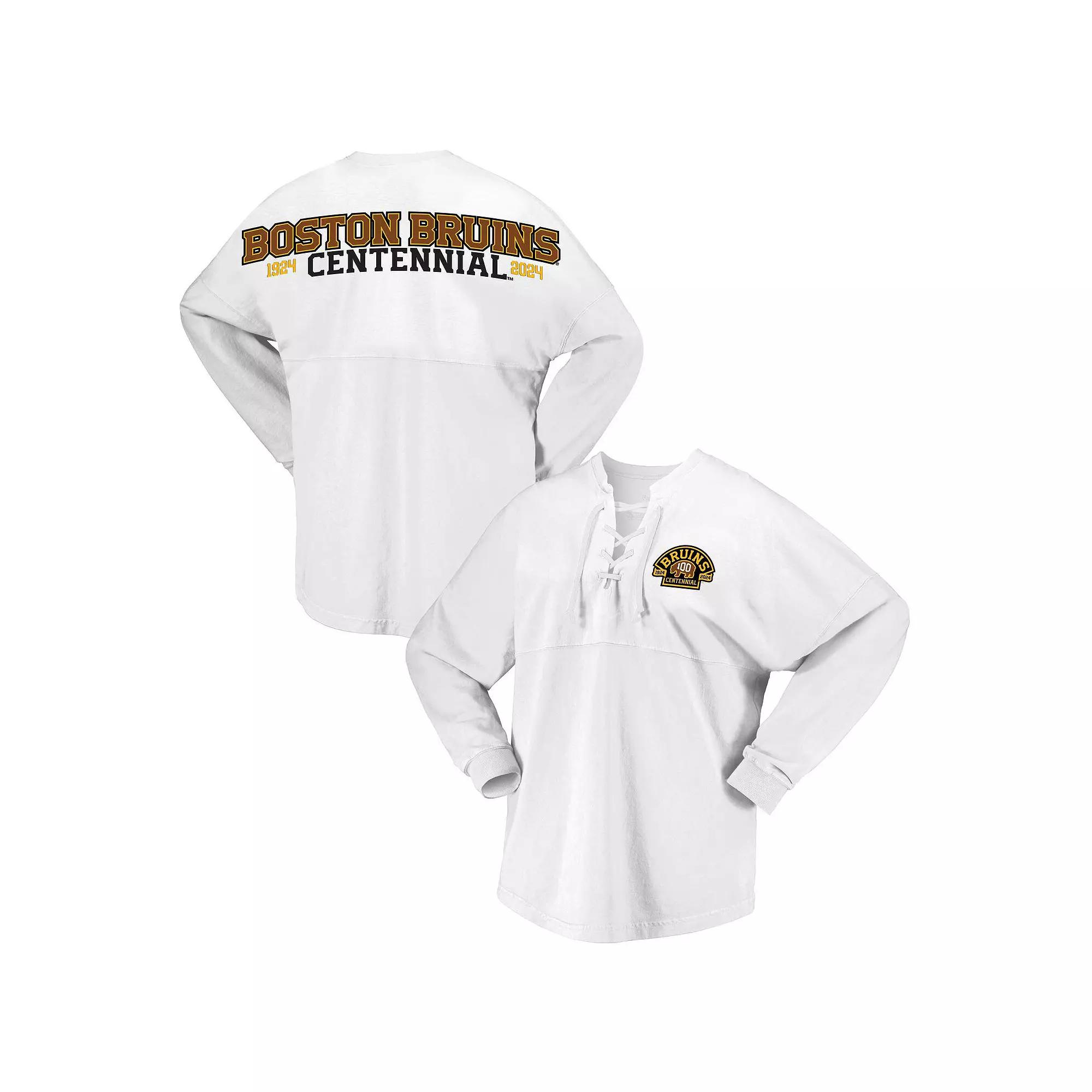 Celebrate the Boston Bruins 100th anniversary with the Fanatics Branded White Boston Bruins 100th Anniversary Spirit Jersey T-Shirt. This stylish tee features low-puff screen print graphics, dropped shoulders, and a lace-up neckline, making it a unique and eye-catching way to show your Bruins pride. The rounded droptail hem adds a touch of flair, while the cotton material ensures comfort and breathability. Whether youre cheering from the stands or simply showing your support, this spirit jersey is the perfect way to represent the Boston Bruins.Celebrate the Boston Bruins 100th anniversary with the Fanatics Branded White Boston Bruins 100th Anniversary Spirit Jersey T-Shirt. This stylish tee features low-puff screen print graphics, dropped shoulders, and a lace-up neckline, making it a unique and eye-catching way to show your Bruins pride. The rounded droptail hem adds a touch of flair, while the cotton material ensures comfort and breathability. Whether youre cheering from the stands or simply showing your support, this spirit jersey is the perfect way to represent the Boston Bruins.PRODUCT FEATURESOfficially licensedLong sleeveImportedMaterial: 100% CottonDropped shouldersLace-up necklineBrand: Fanatics BrandedRounded droptail hemLow-puff screen print graphicsMachine wash, tumble dry low Size: XL. Color: BSB WHITE. Gender: female. Age Group: adult.