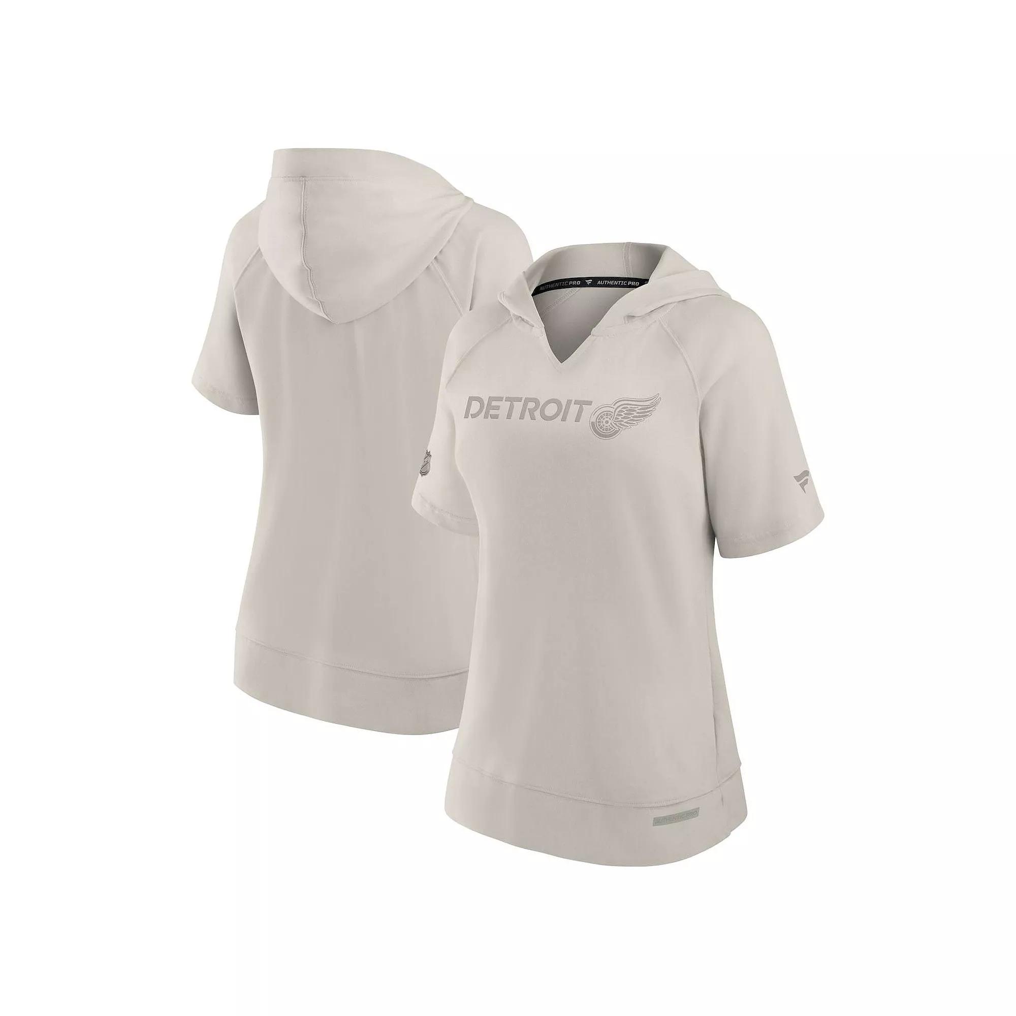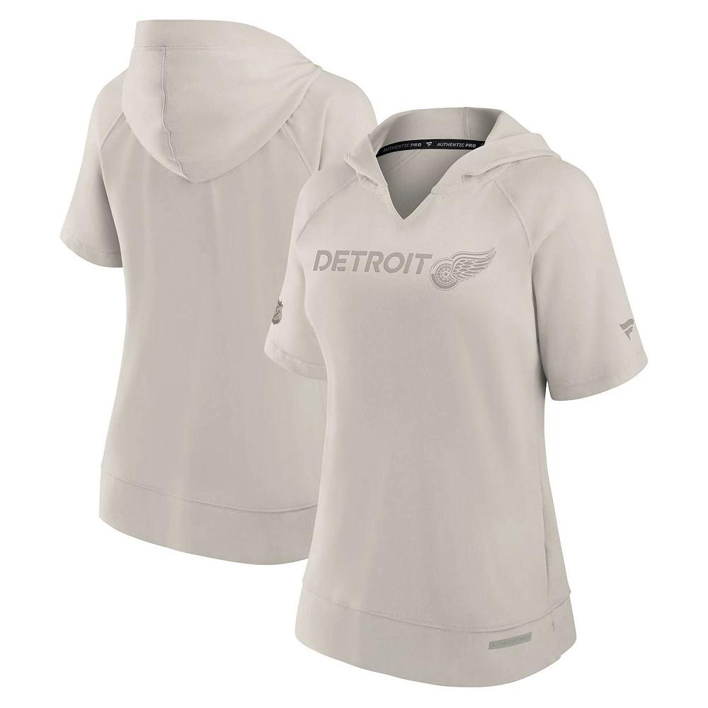 Express your Detroit Red Wings spirit in style with this Fanatics Authentic Pro Road Short Sleeve V-Neck Pullover Hoodie. This incredibly soft and comfortable hoodie features a classic graphic printed at the center chest, giving it a timeless look. The V-neck, tapered trim and raglan sleeves create a flattering and fashionable silhouette. Brand: Fanatics. Screen print graphics. Short sleeve. Material: 100% Cotton. Machine wash, tumble dry low. Raglan sleeves. Hooded. This item is non-returnable. V-neck. Pullover. Imported. Officially licensed. Color: Beige. Gender: female. Age Group: adult.