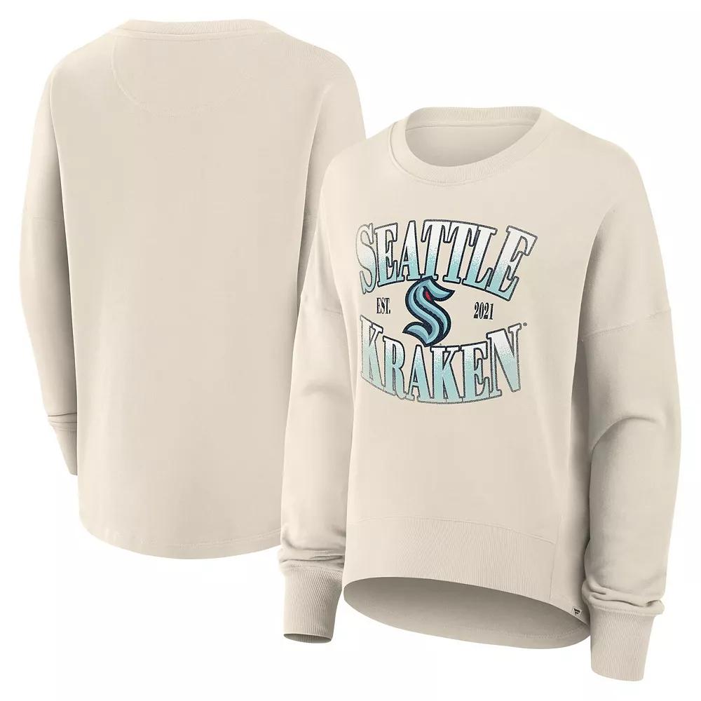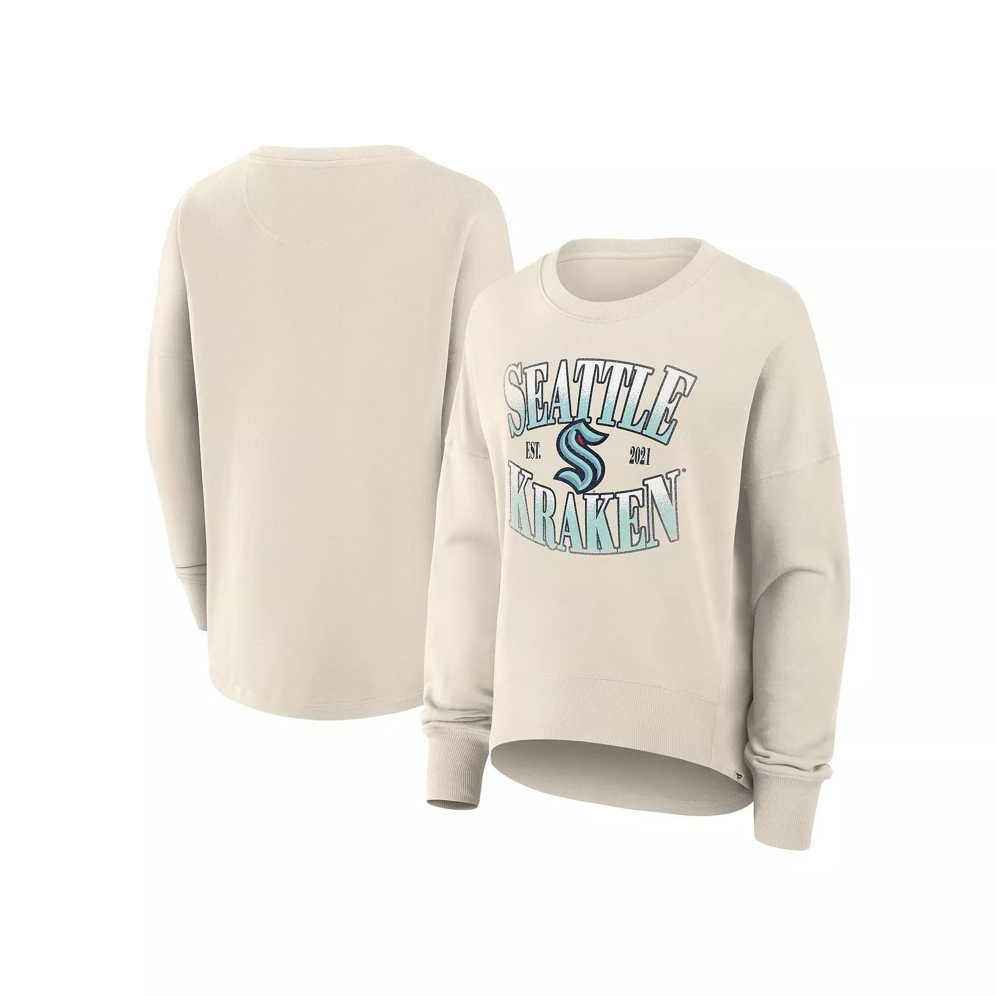 Stay comfy in fashionable Seattle Kraken outerwear with this Oversized Slice Pullover Sweatshirt by Fanatics. Its oversized fit and dropped shoulders provide a roomy, relaxed feel and trendy look. The breathable warmth of French terry fabric makes this Seattle Kraken sweatshirt a cool-weather favorite. Brand: Fanatics. Machine wash, tumble dry low. French terry fabric has a heavyweight feel (300gsm). Hip length (Measures approx. 24). Dropped shoulder seams provide ease of movement. Embroidered team logo. Pullover. Oversized Fit: Intentionally designed with wider and longer proportions for a spacious feel and a laidback look. For a less relaxed fit, consider sizing down. Rubberized team name. Long sleeve. Model is 5'10 and wearing size M. Imported. Rounded droptail back hem (Measures approx. 27''). Material: 100% Cotton. Officially licensed. Size: XL. Color: Krk Beige. Gender: female. Age Group: adult.