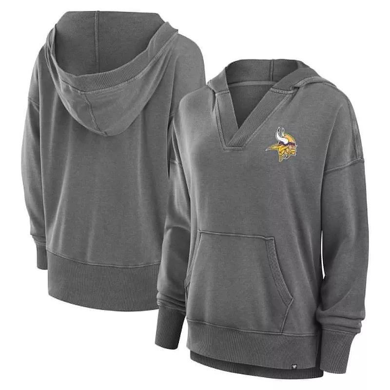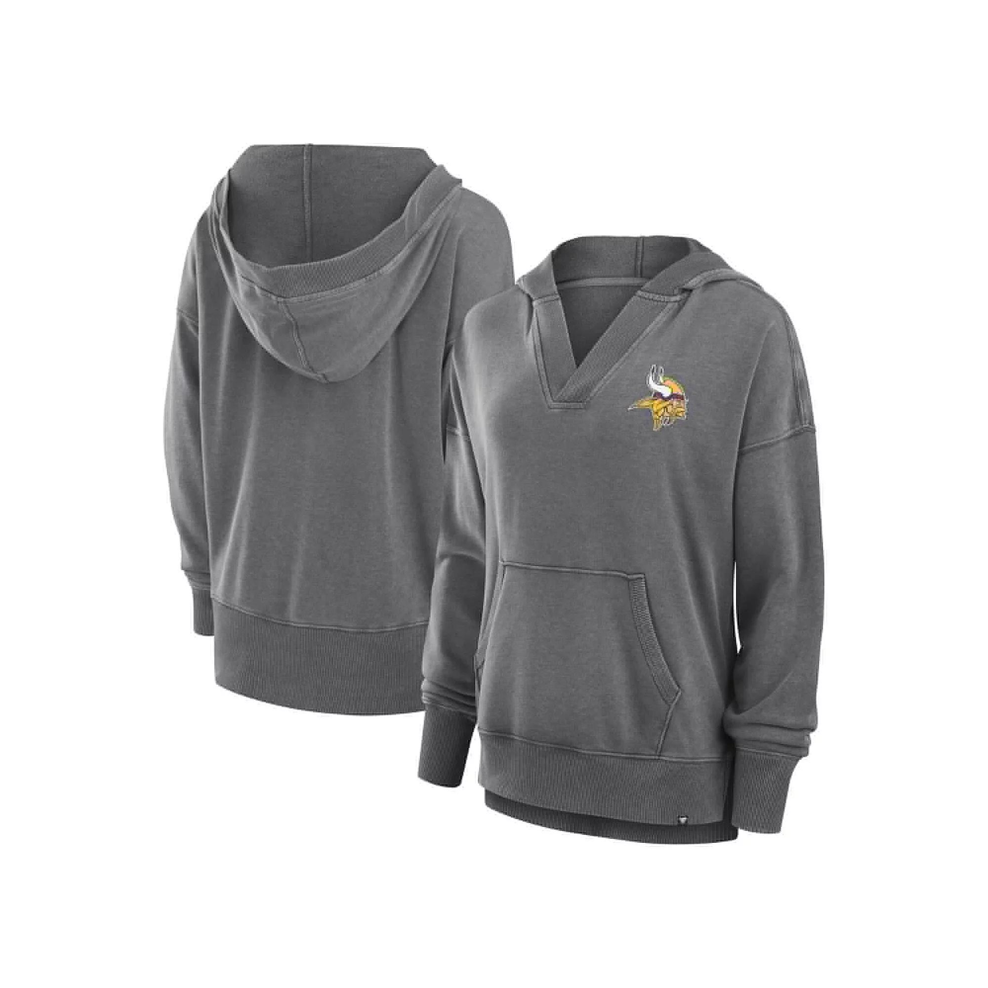 Stay cozy while repping your Minnesota Vikings pride with this Initiative Snow Wash French Terry V-Neck Pullover Hoodie from Fanatics. This cozy hoodie features a vintage-inspired snow wash and a super-soft French terry fabric for a luxuriously comfy feel. The oversized fit with drop shoulders makes it perfect for layering over game day tees or pairing with leggings for a casual yet spirited look.Stay cozy while repping your Minnesota Vikings pride with this Initiative Snow Wash French Terry V-Neck Pullover Hoodie from Fanatics. This cozy hoodie features a vintage-inspired snow wash and a super-soft French terry fabric for a luxuriously comfy feel. The oversized fit with drop shoulders makes it perfect for layering over game day tees or pairing with leggings for a casual yet spirited look.PRODUCT FEATURESFront pouch pocket for extra warmth or storing small itemsPulloverRib-knit cuffs, neckline and hemHoodedV-neckMaterial: 60% Cotton/40% Polyester French TerryMidweight hoodie suitable for moderate temperaturesBrand: FanaticsMachine wash, tumble dry lowDroptail hem with side splits delivers flattering fitLong sleeveWashed fabric for vintage lookImportedCozy, oversized drop shoulder designScreen print team logo on left chestOfficially licensed Size: XS. Color: Charco. Gender: female. Age Group: adult.