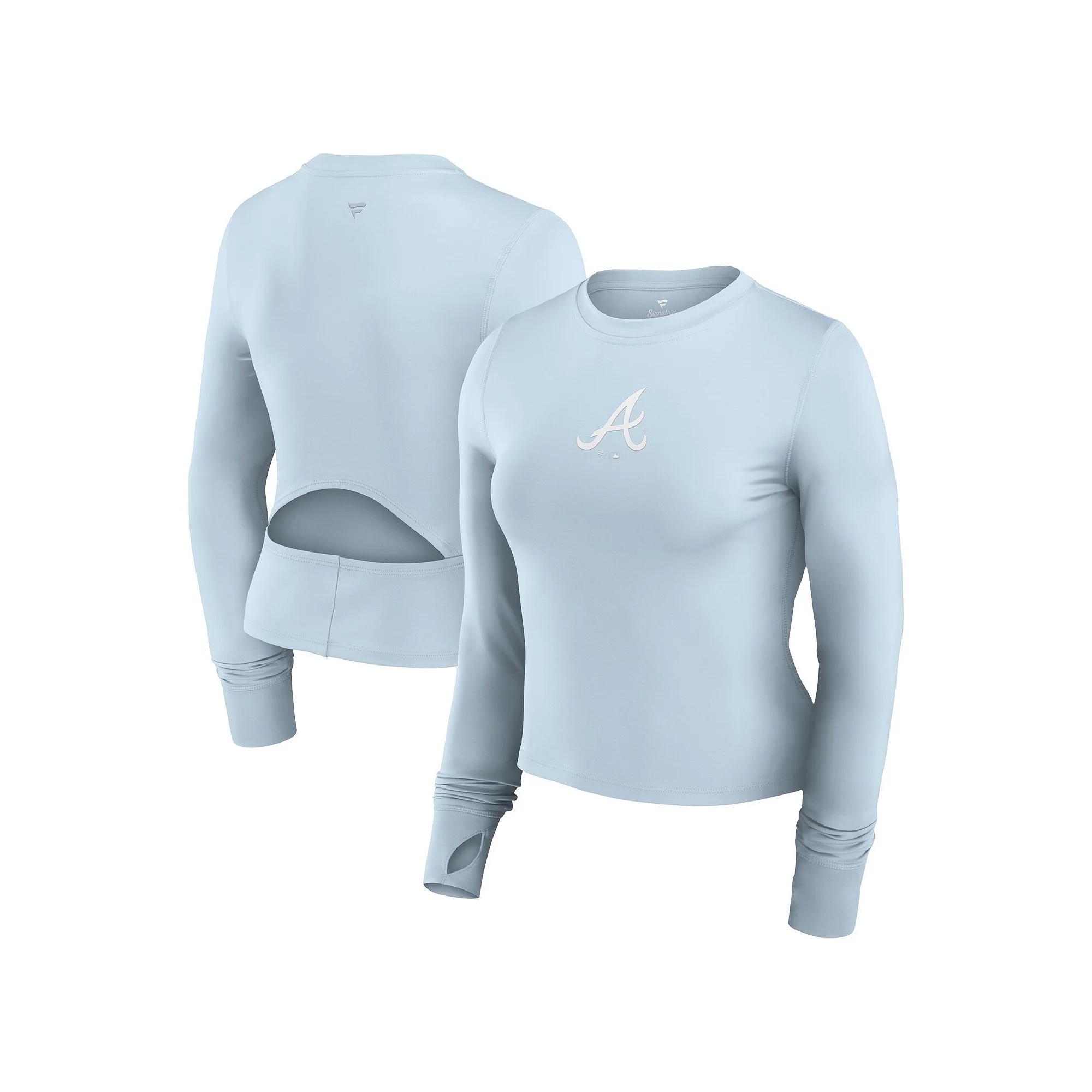 Your signature is an expression of identity that's as unique as you are. Step up the versatility and look of your athleisure wear with this Fanatics Studio Fitted Gym top. An opening in the back adds breathability, and a thumbhole at the cuffs secures the fit while you're active. Jacquard fabric featuring your team's logo stretches for premium comfort. Don't just leave an impression, make your mark. Machine wash, tumble dry low. Long sleeve. Cropped hem. Brand: Fanatics. Imported. Officially licensed. Crew neck. Opening at bottom of back. Heat-sealed graphics. Material: 88% Polyester/12% Spandex. Thumbhole in cuffs. Color: Light. Gender: female. Age Group: adult. Material: COTTON.