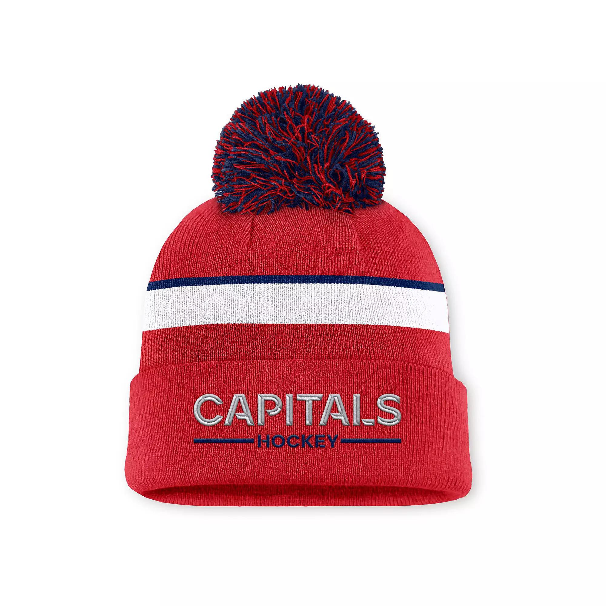 Prepare to face off against cold weather in this Authentic Pro Rink Cuffed Knit Hat with Pom by Fanatics. Made from lightweight yarn for a comfy feel, it features the same design and premium construction the team wears. The coordinating pom adds classic winter flair to this knit Washington Capitals hat. Brand: Fanatics. Pom on top. Officially licensed. One size fits most. Made of lightweight yarn. Jacquard stripes in team-specific colors. Authentic Pro Rink Collection is the official performance gear issued to NHL teams for wearing on and off the ice. Hand wash, dry flat. Holographic micro NHL shield on back. Two-tone jumbo pom. Cuffed knit hat. Material: 100% Acrylic. Imported. Team logo embroidered with raised details on cuff. Gender: female. Age Group: adult. Material: COTTON.