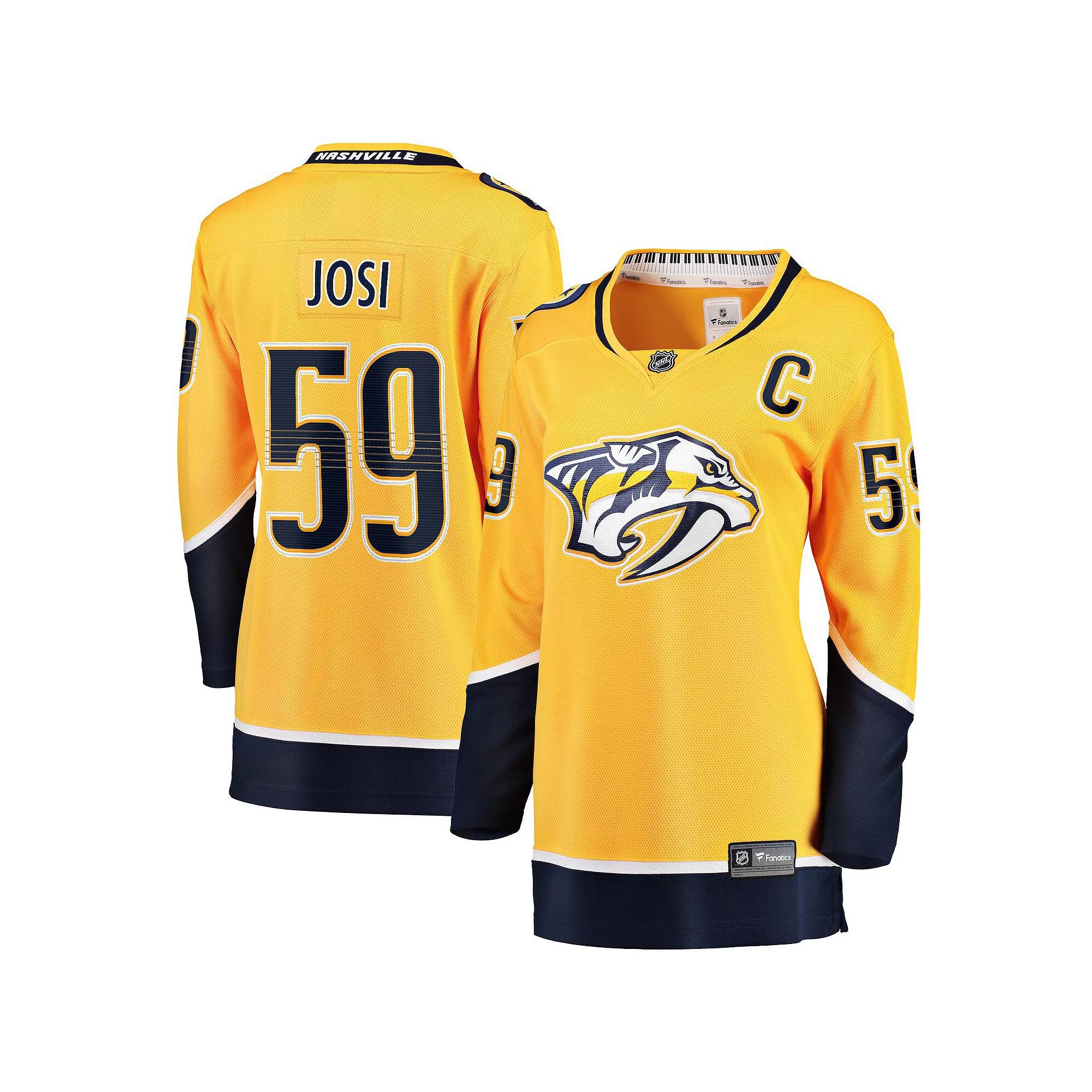 Refresh your Nashville Predators gear with this Roman Josi Breakaway jersey from Fanatics. It features the same authentic team graphics and colors your Nashville Predators wear on the ice. This Roman Josi jersey is also crafted with lightweight trims, breathable material and a tailored fit to ensure a comfortable experience on game day. Soft double-knit fabric has a midweight feel (205gsm). Heat-pressed sublimated embossed twill shoulder patches with faux zigzag stitching. Machine wash, tumble dry low. Classic Fit: Tunic-length jersey that's designed specifically for women with a closer fit to the body. If you are in between sizes, consider sizing up for a roomier fit or to layer with a sweatshirt. Fanatics branded woven jock tag. Fanatics Breakaway. Material: 100% Polyester Jersey. Long sleeve. Heat-pressed sublimated twill name and numbers. Sewn-down sublimated embossed twill cresting. Officially licensed. Direct embroidered NHL Shield. Brand: Fanatics. Imported. Jersey Color Style: Home. Color: Pdt Gold. Gender: female. Age Group: adult. Material: COTTON.