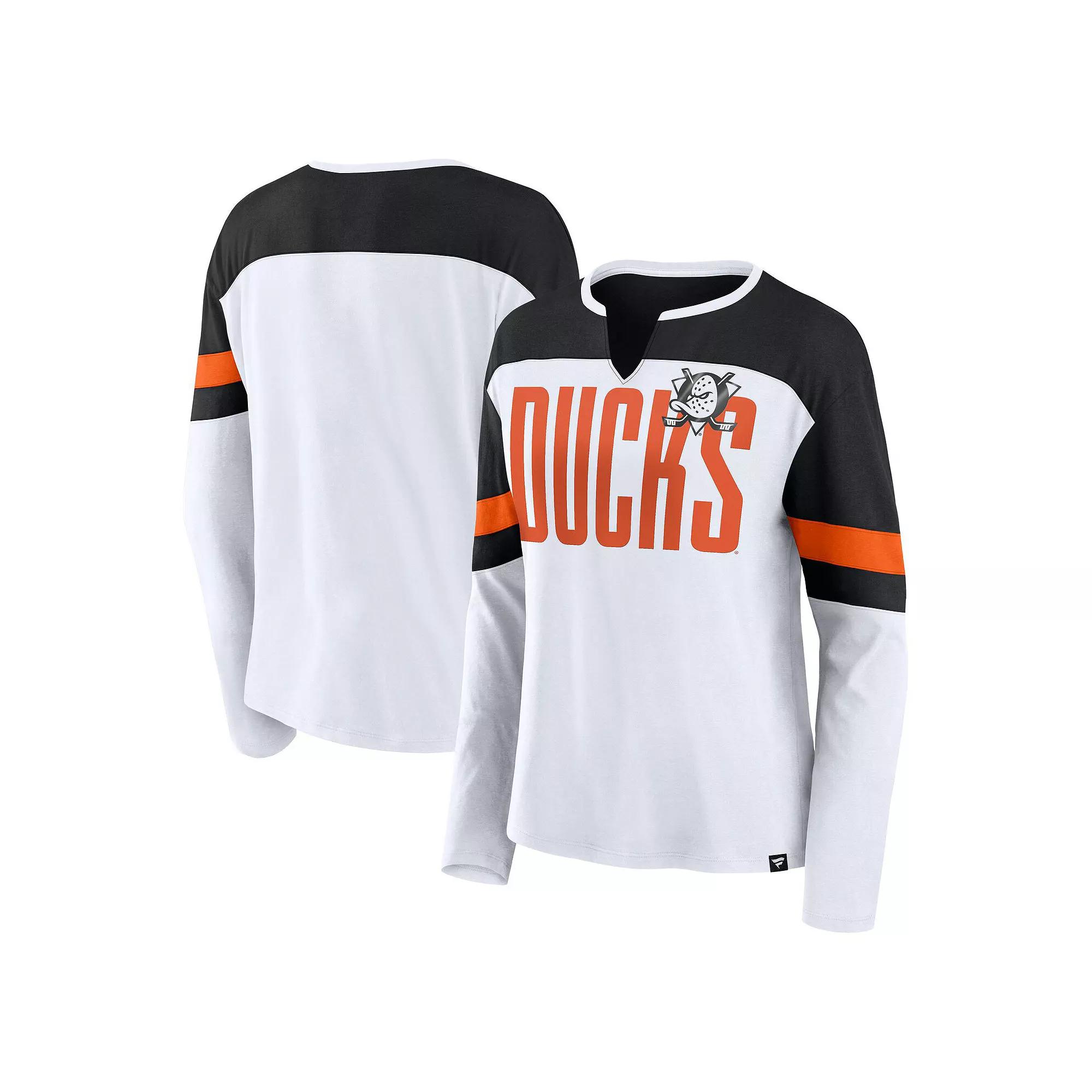 Embrace the chill of game day with this Anaheim Ducks Frozen Long Sleeve Notch Neck T-Shirt from Fanatics. The dropped shoulder seams provide a relaxed fit perfect for cheering from the stands or casual settings. Enlarged lettering and a foil team logo make it clear youre a devoted Anaheim Ducks fan.Embrace the chill of game day with this Anaheim Ducks Frozen Long Sleeve Notch Neck T-Shirt from Fanatics. The dropped shoulder seams provide a relaxed fit perfect for cheering from the stands or casual settings. Enlarged lettering and a foil team logo make it clear youre a devoted Anaheim Ducks fan.PRODUCT FEATURESNotch neckFront and back yokeBrand: FanaticsFoil screen print team logo at left chestMaterial: 50% Cotton/50% PolyesterEnlarged team name printed across the frontLong sleeveDropped shoulder seams provide a relaxed fitOfficially licensedSewn-on sleeve stripesImportedMachine wash, tumble dry low Color: Dks White. Gender: female. Age Group: adult.