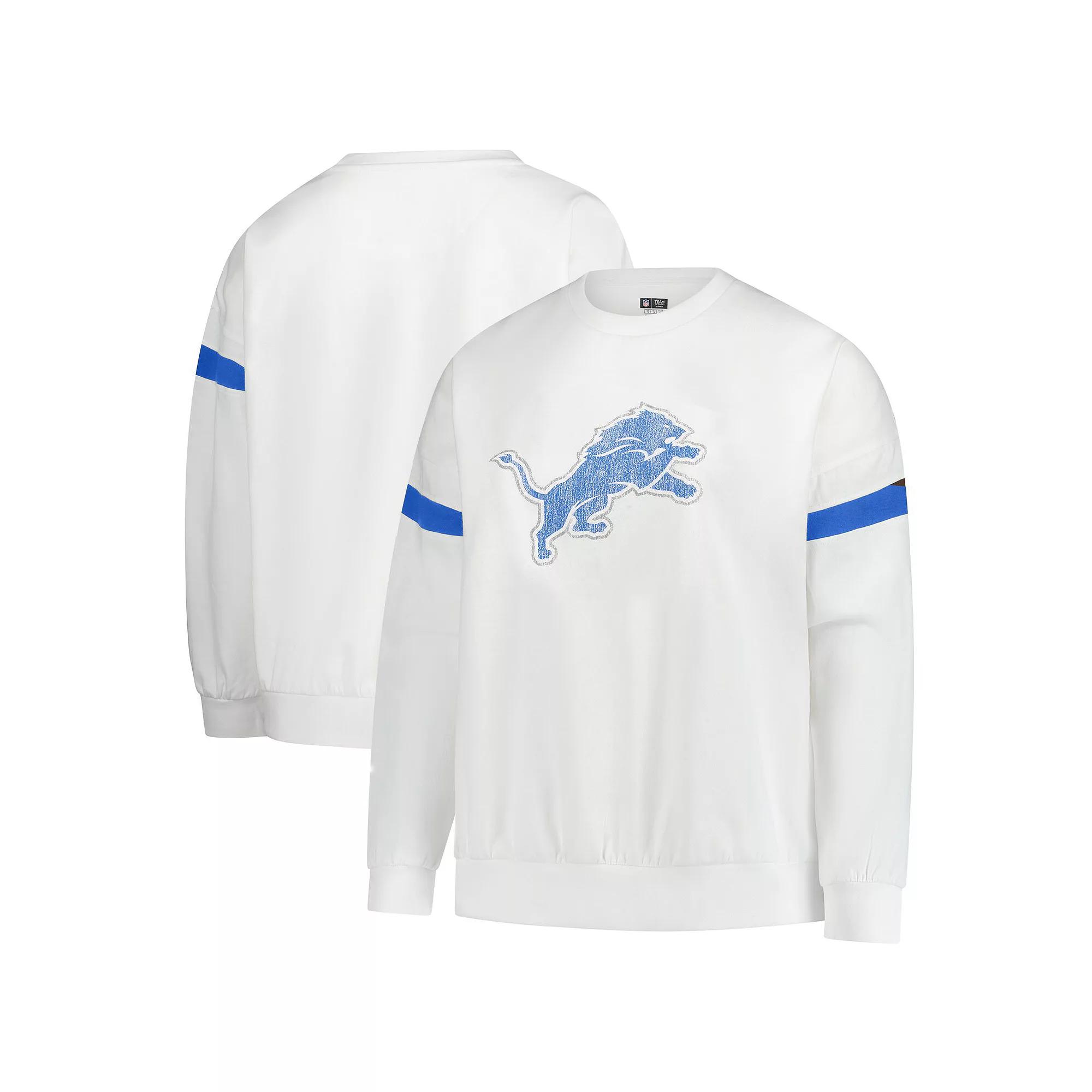 Stay cozy and show off your Detroit Lions pride with this Fleece Pullover Sweatshirt from Fanatics. This incredibly soft fleece sweatshirt boasts a relaxed, loose fit and a slightly cropped hem that sits right at the hip for a flattering look. The contrast-color striped insets at the shoulders and distressed screen print team logo at the front add a touch of sporty style.Stay cozy and show off your Detroit Lions pride with this Fleece Pullover Sweatshirt from Fanatics. This incredibly soft fleece sweatshirt boasts a relaxed, loose fit and a slightly cropped hem that sits right at the hip for a flattering look. The contrast-color striped insets at the shoulders and distressed screen print team logo at the front add a touch of sporty style.PRODUCT FEATURESImportedLong sleeveMachine wash, tumble dry lowBrand: FanaticsMaterial: 60% Cotton/40% PolyesterThick waistband with side splitsPulloverOfficially licensedDropped shouldersMidweight sweatshirt suited for moderate temperaturesRelaxed, loose fit, for a more snug fit consider sizing downContrast-color striped insets at shouldersDistressed screen print team logo at frontSlightly cropped hem that sits right at the hip Size: 1X. Color: White. Gender: female. Age Group: adult.