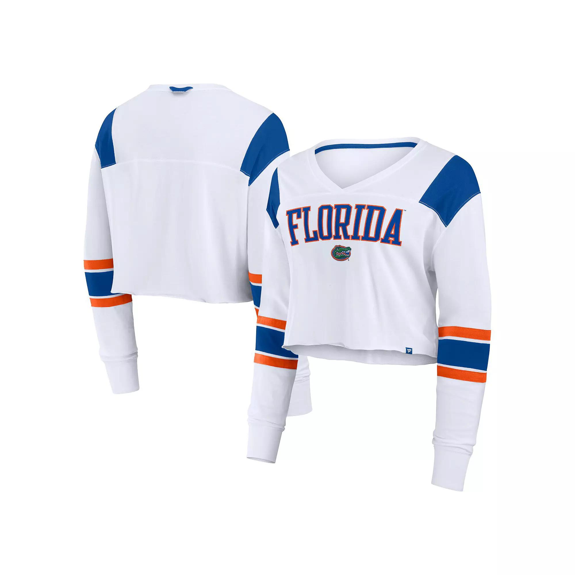 Stay cool and comfortable while repping your Florida Gators with this Training Camp Cropped Long Sleeve V-Neck Fashion Top from Fanatics. With dropped shoulder seams for a relaxed fit and an on-trend cropped hem, this tee offers a flattering silhouette for any Gators fan. The soft cotton-modal blend fabric and contrast-color sleeve inserts make it both comfortable and stylish for everyday wear.Stay cool and comfortable while repping your Florida Gators with this Training Camp Cropped Long Sleeve V-Neck Fashion Top from Fanatics. With dropped shoulder seams for a relaxed fit and an on-trend cropped hem, this tee offers a flattering silhouette for any Gators fan. The soft cotton-modal blend fabric and contrast-color sleeve inserts make it both comfortable and stylish for everyday wear.PRODUCT FEATURESBrand: FanaticsImportedEmbroidered fabric applique team logo below wordmarkDropped shoulder seams provide a relaxed fitMaterial: 60% Cotton/40% ModalOfficially licensedUnfinished cropped hem hits at the waistLong sleeveMachine wash, tumble dry lowScreen print wordmark across the frontContrast-color insets in sleevesV-Neck Size: XL. Color: White. Gender: female. Age Group: adult.