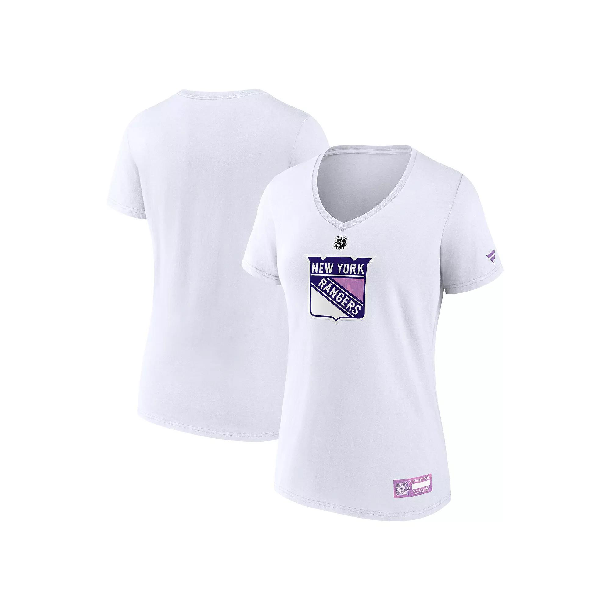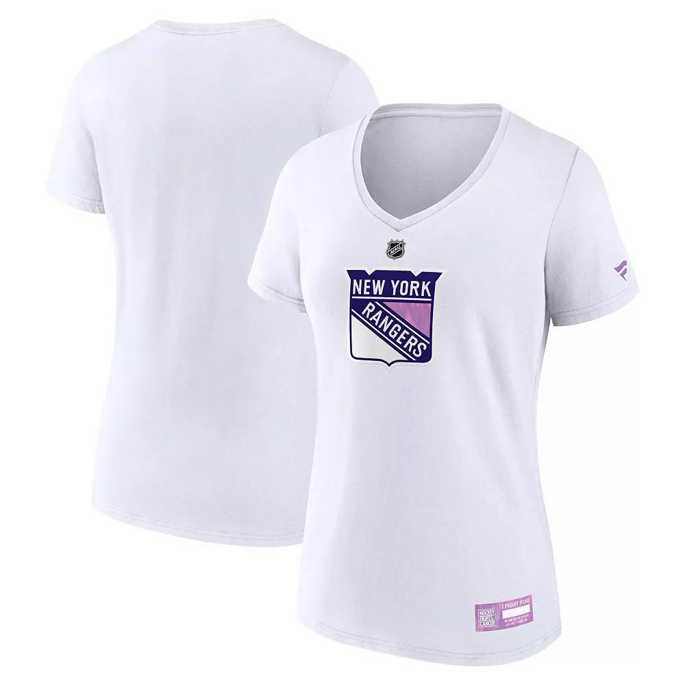Join the New York Rangers in supporting those battling cancer with this 2024 Hockey Fights Cancer V-Neck T-Shirt by Fanatics. Team details printed on the front make it clear you stand with the league on this important initiative. Soft, breathable cotton fabric keeps you comfortable in this meaningful New York Rangers tee. When the NHL's online store purchases Hockey Fights Cancer products from its licensee partners to sell on NHLShop.com, NHL Enterprises, LP and the licensee partners donate funds to the National Hockey League Foundation, a US 501(c)(3) tax-exempt private foundation, toward the Hockey Fights Cancer initiative. Your purchase tells us that you support the NHL's efforts to raise awareness in the fight against cancer. V-neck. Team name and logo screen printed at center chest. Machine wash, tumble dry low. This item is non-returnable. Short sleeve. Officially licensed. Imported. Jersey fabric has a lightweight feel (150gsm). Woven jock tag at bottom left hem. Material: 100% Cotton. Brand: Fanatics. Color: Ran White. Gender: female. Age Group: adult.