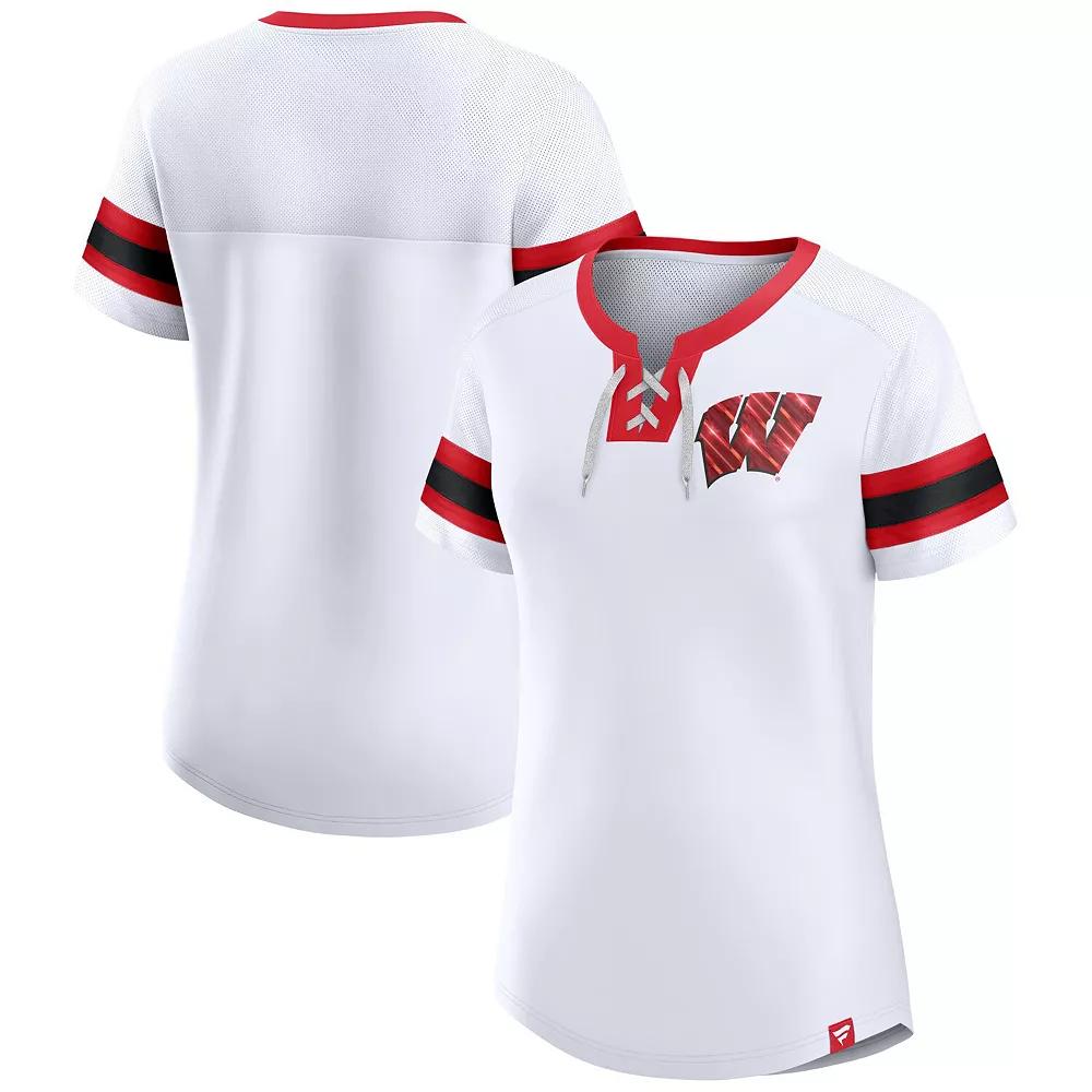 Top off any Wisconsin Badgers look with this Iconic Athena T-Shirt from Fanatics. It features a lace-up neck and mesh panels on the shoulder for extra style and comfort. The Wisconsin Badgers logo on the chest and matching stripes on the sleeves add spirited details to this must-have tee.Top off any Wisconsin Badgers look with this Iconic Athena T-Shirt from Fanatics. It features a lace-up neck and mesh panels on the shoulder for extra style and comfort. The Wisconsin Badgers logo on the chest and matching stripes on the sleeves add spirited details to this must-have tee.PRODUCT FEATURESMaterial: 100% PolyesterMachine wash, tumble dry lowImportedRounded droptail hemMesh sleeves and yokes provide breathabilityLace-up neckBrand: FanaticsShort sleeveScreen print graphicsThree-stripe insets at sleevesOfficially licensedCrew neck Size: XL. Color: White. Gender: female. Age Group: adult. Material: COTTON.
