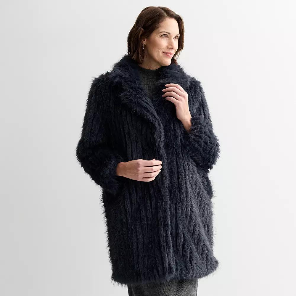 The Women's Farmers Market Faux Fur Long Coat provides luxurious warmth and an elegant look with its soft faux fur and long silhouette. Click on this WOMEN'S GUIDE to find the perfect fit and more! - https://www.kohls.com/feature/womens-fit-guide.jsp. FEATURES: Faux fur detailing, Long sleeves, 2 functional side pockets, Fully lined, Snap closure. FIT & SIZING: 36 3/4-in. length from shoulder to hem, Relaxed fit, Snap closure. FABRIC & CARE: Polyester, Lining: Polyester, Dry clean, Imported. Size: Large. Color: Midnight Blue. Gender: female. Age Group: adult. Material: OTHER MATERIAL.