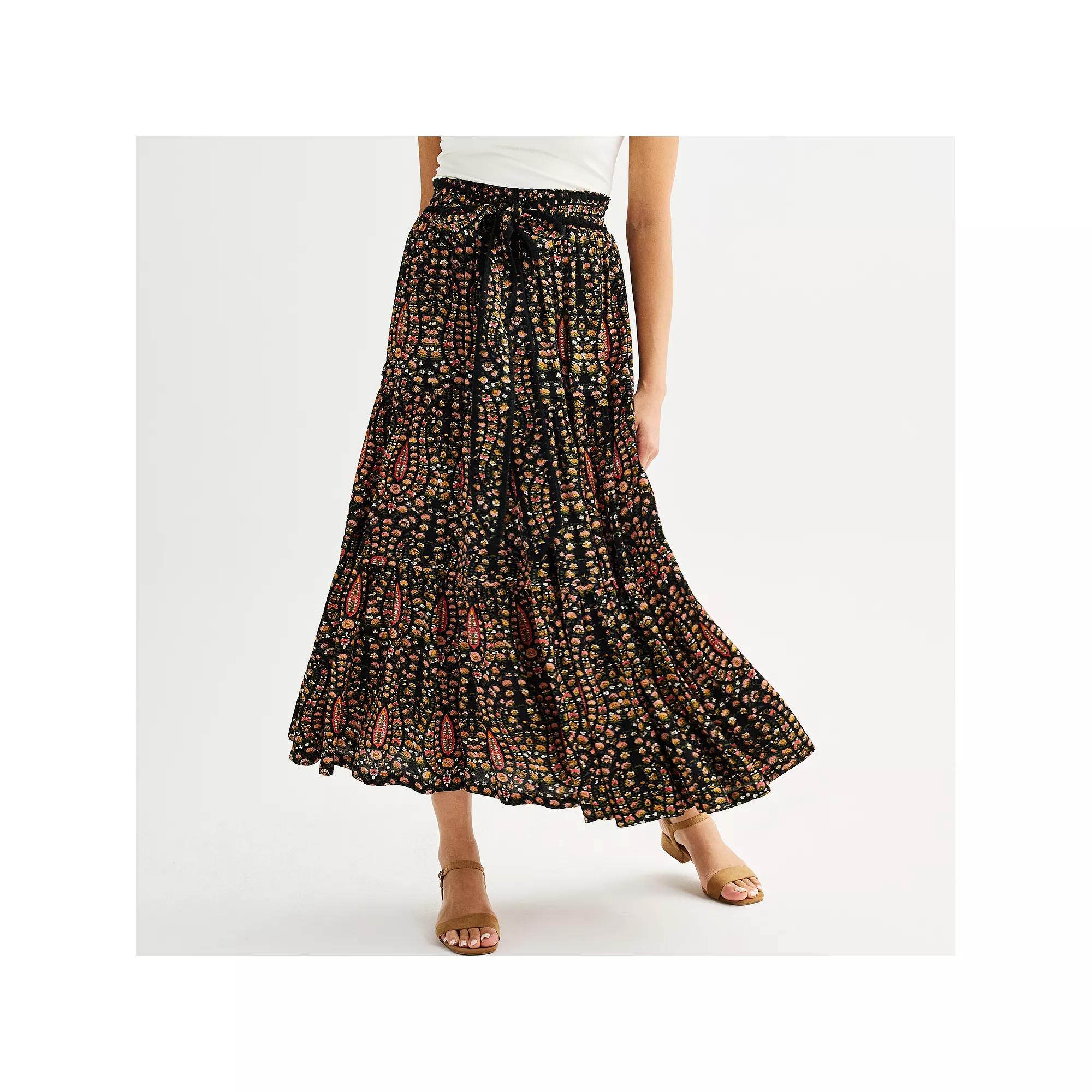 This women's printed flare tiered maxi skirt from Farmers Market is sure to quickly become a favorite piece in your wardrobe.Click on this WOMEN'S GUIDE to find the perfect fit and more! This women's printed flare tiered maxi skirt from Farmers Market is sure to quickly become a favorite piece in your wardrobe. Click on this WOMEN'S GUIDE to find the perfect fit and more! FEATURES FLARE TIERED PRINTED MAXI SKIRT No closure - pull-on styling Elastic waistband Coordinating belt Straight hem UnlinedFIT & SIZING Regular fit 36 1/2-in. length Maxi length hits at the ankle Midrise sits on the high hip Relaxed fit through the hip and thighFABRIC & CARE Viscose Machine wash and tumble dry low Imported Size: Medium. Color: Garden Carnival. Gender: female. Age Group: adult.