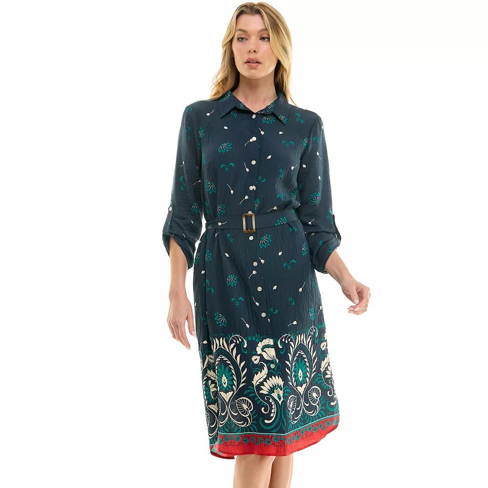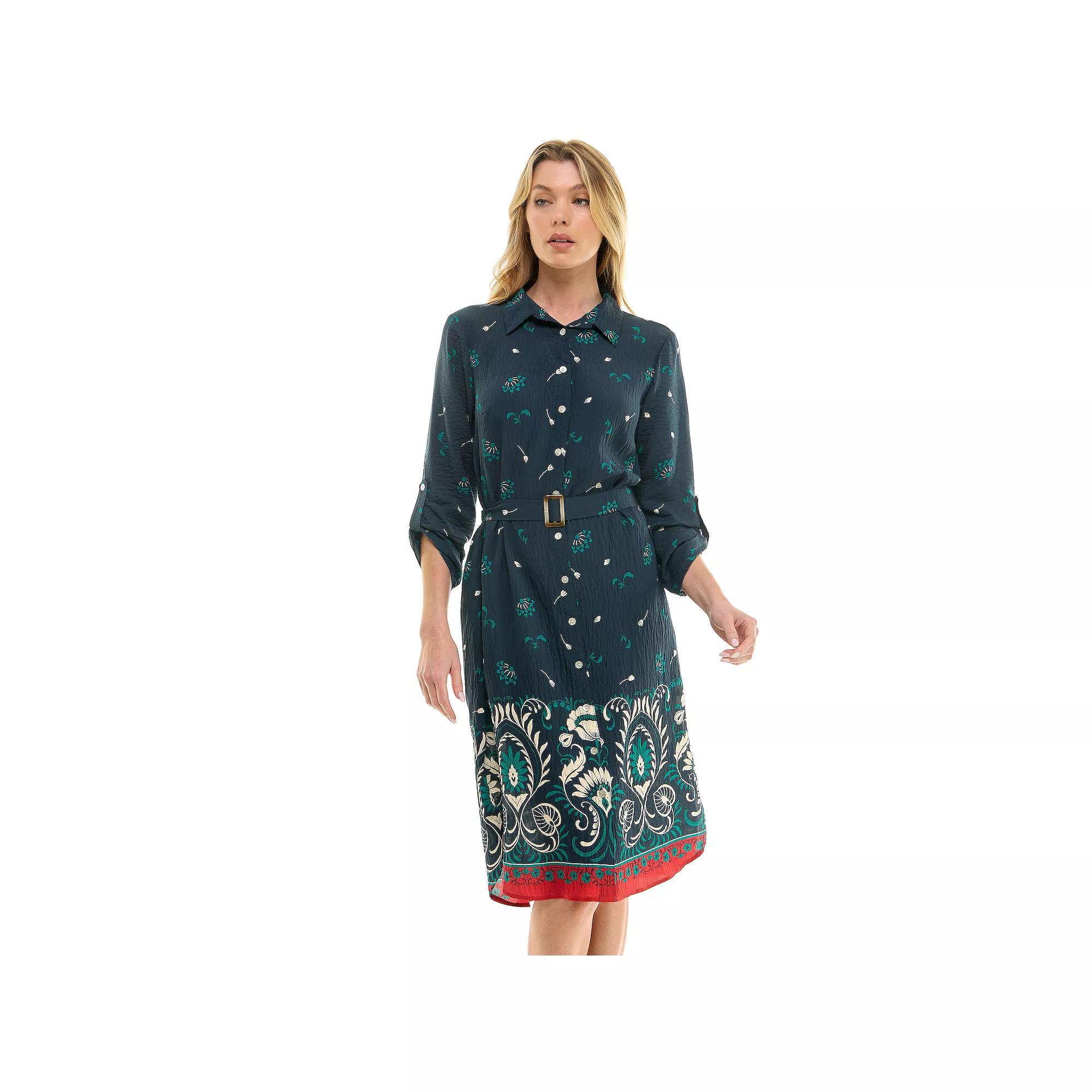 The Women's Figueroa & Flower Button Front Shirt Dress offers effortless charm with its button-front design and relaxed fit.Click on this WOMEN'S GUIDE to find the perfect fit and more!FEATURES Woven no pockets Button closure Button cuffs 3/4-length sleeves Coordinating sash Collared neckline, V-neckFIT & SIZING Relaxed fit 53-in. length from shoulder to hem Midi length hits below the kneeFABRIC & CARE Rayon Machine wash and line dry Imported Size: Small. Color: Midnight. Gender: female. Age Group: adult.