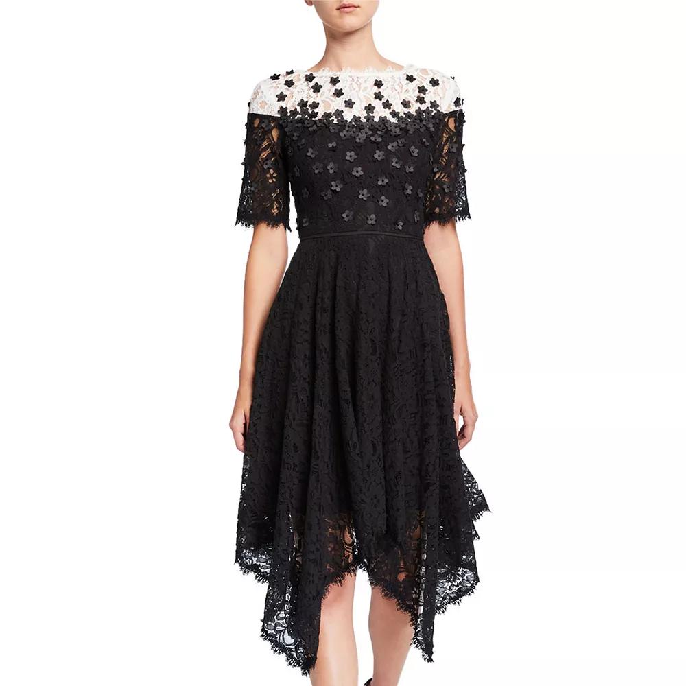 You'll love the charming style of this women's Focus By Shani Floral Applique Lace Handkerchief Dress.You'll love the charming style of this women's Focus By Shani Floral Applique Lace Handkerchief Dress.FEATURES Fit & flare silhouette Boatneck Elbow sleeves Zipper back High-low hemFIT & SIZING 39-in. length from shoulder to hem Midi length hits below the kneeFABRIC & CARE Cotton, nylon Lining: polyester Dry clean Imported Size: 14. Color: Black White. Gender: female. Age Group: adult.
