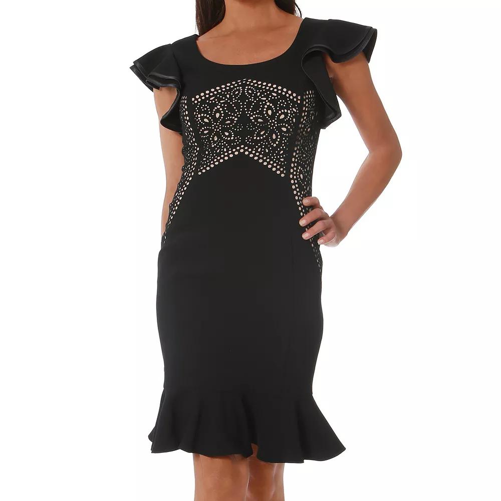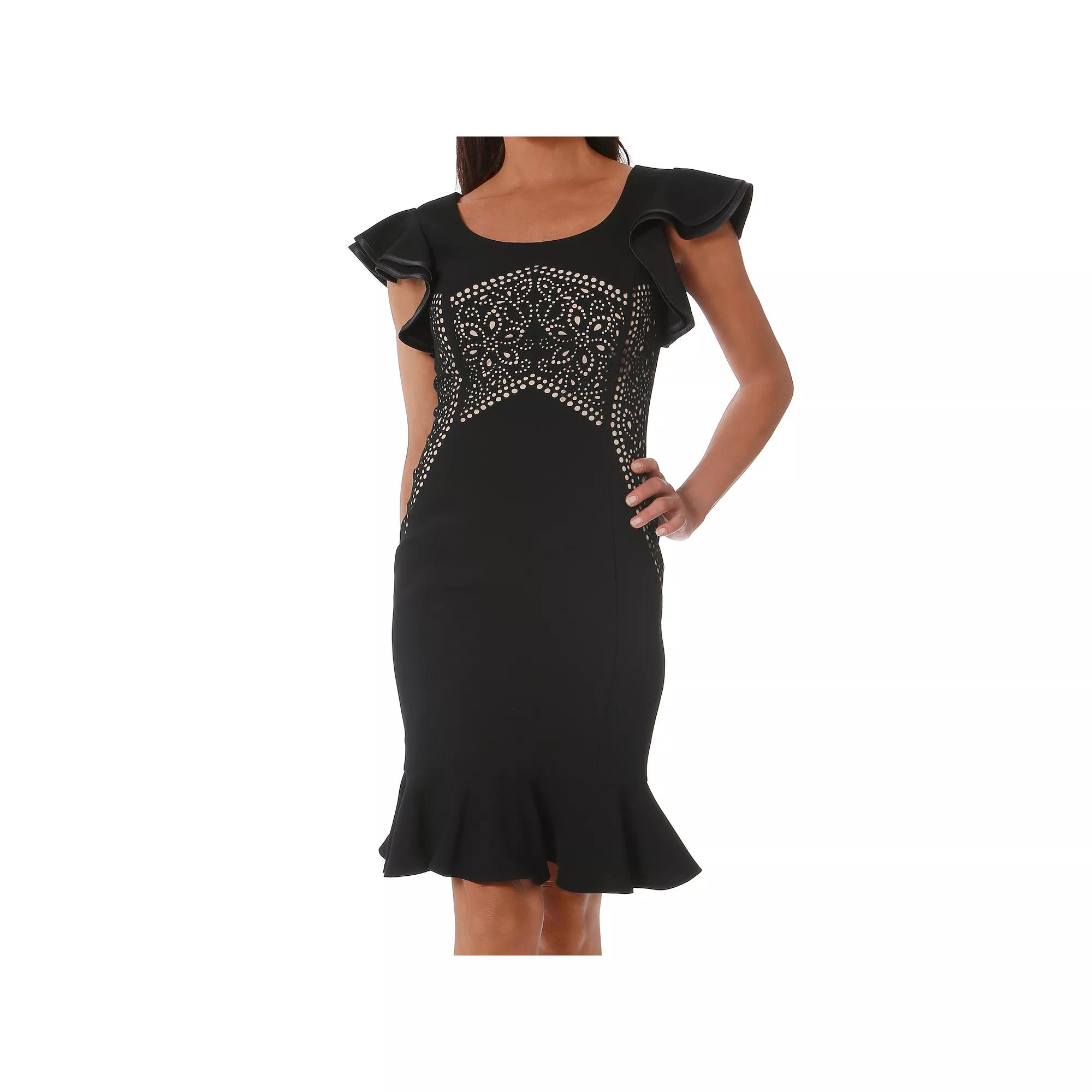 This laser cutting dress from Focus By Shani boasts a gorgeous floral pattern across the chest and sides beneath playfully elegant flutter sleeves.Click on this WOMENS GUIDE to find the perfect fit and more! FEATURES Sheath silhouette Flounce hem Zipper back Short flutter sleeves Fully lined BoatneckFIT & SIZING 39-in. length from shoulder to hem Midi length hits below the kneeFABRIC & CARE Polyester Dry clean Imported Size: 12. Color: Black. Gender: female. Age Group: adult.