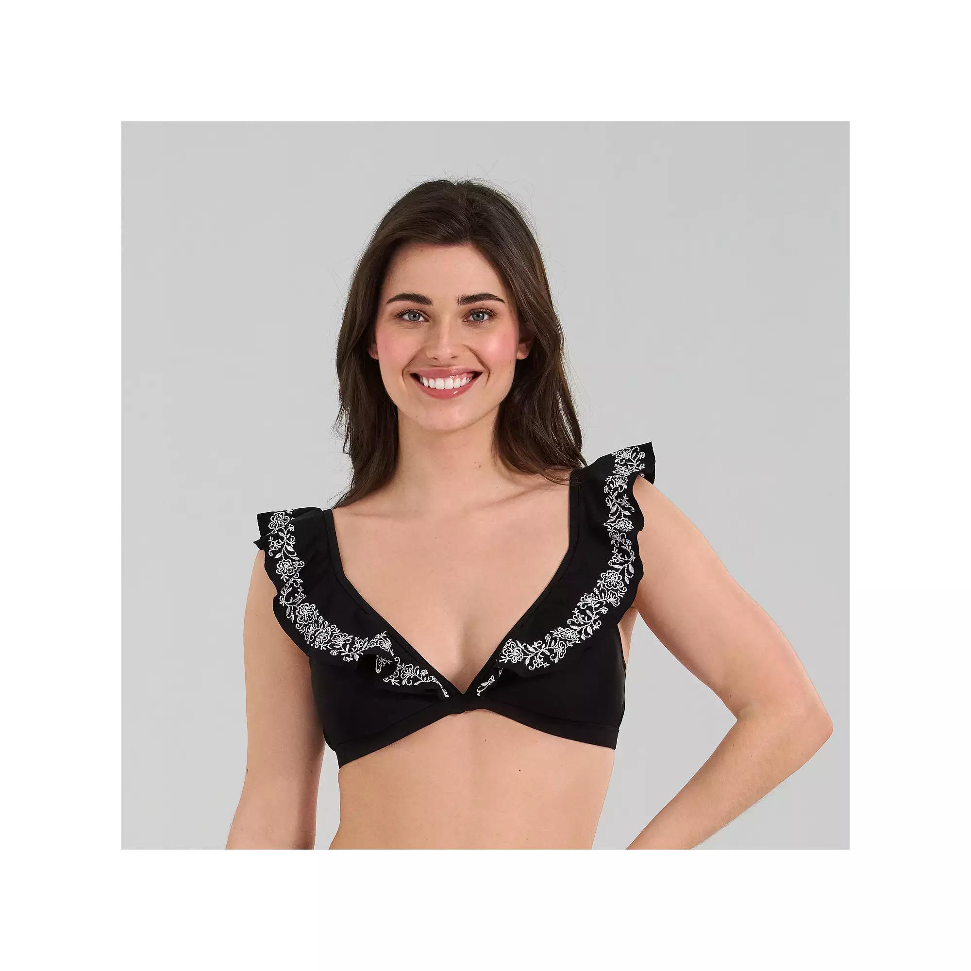 Elevate your everyday swimwear with this charming piece from Freshwater, designed to blend comfort and style effortlessly. The delicate embroidered ruffle detail adds a touch of femininity, making it a perfect choice for both casual wear and special occasions. Click on this WOMEN'S GUIDE to find the perfect fit and more! - https://www.kohls.com/feature/womens-fit-guide.jsp. FEATURES: Removable cups, Moderate coverage, Hook & loop closure, Fully lined, Wireless, V-neck. FIT & SIZING: Adjustable straps. FABRIC & CARE: Body: recycled nylon, spandex, Lining: recycled polyester, Hand wash and line dry, Imported. Size: Medium. Color: Black Embroidery. Gender: female. Age Group: adult. Material: NYLON SPANDEX.