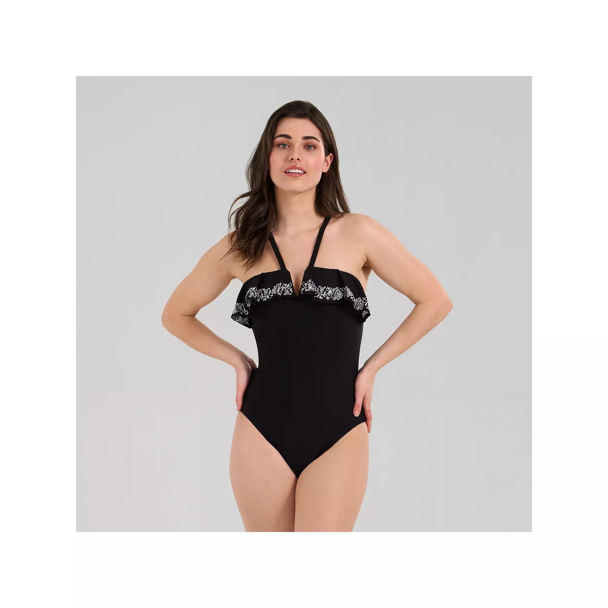 Dive into summer style with Freshwater's chic one-piece, featuring a playful ruffle design and elegant embroidery. Made with a soft lining, this swimsuit combines fashion and practicality for your perfect poolside look. Click on this WOMEN'S GUIDE to find the perfect fit and more! - https://www.kohls.com/feature/womens-fit-guide.jsp. FEATURES: Removable cups, Moderate coverage, Sleeveless, Fully lined, Wireless. FABRIC & CARE: Body: nylon, spandex, Lining: recycled nylon, spandex, Machine wash delicate and line dry, Imported. Size: Medium. Color: Black Embroidery. Gender: female. Age Group: adult. Material: POLY BLEND.