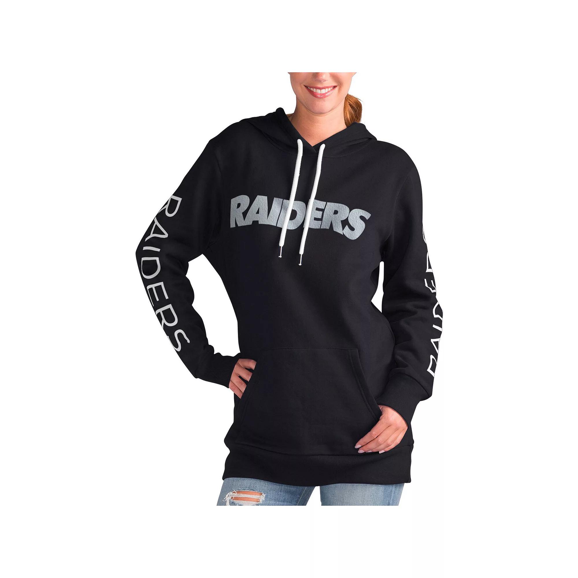 The Women's G-III 4Her by Carl Banks Black Las Vegas Raiders Extra Inning Pullover Hoodie is the perfect way to show unwavering support for the Las Vegas Raiders. Crafted from a soft cotton and polyester blend, this midweight hoodie features a cozy fleece lining for added warmth during chilly game days. Screen-printed Las Vegas Raiders logos proudly display your team spirit, making it a must-have for any devoted fan. Whether cheering from the stands or showing support, this hoodie represents the Las Vegas Raiders in style. Pullover. Material: 60% Cotton/40% Polyester. Front pouch pocket. Fleece lining. Long sleeve. Machine wash, tumble dry low. Screen print graphics. Officially licensed. Imported. Brand: G-III 4Her by Carl Banks. Hood with drawstring. Hooded. Midweight hoodie suitable for moderate temperatures. Color: Lvr Black. Gender: female. Age Group: adult.