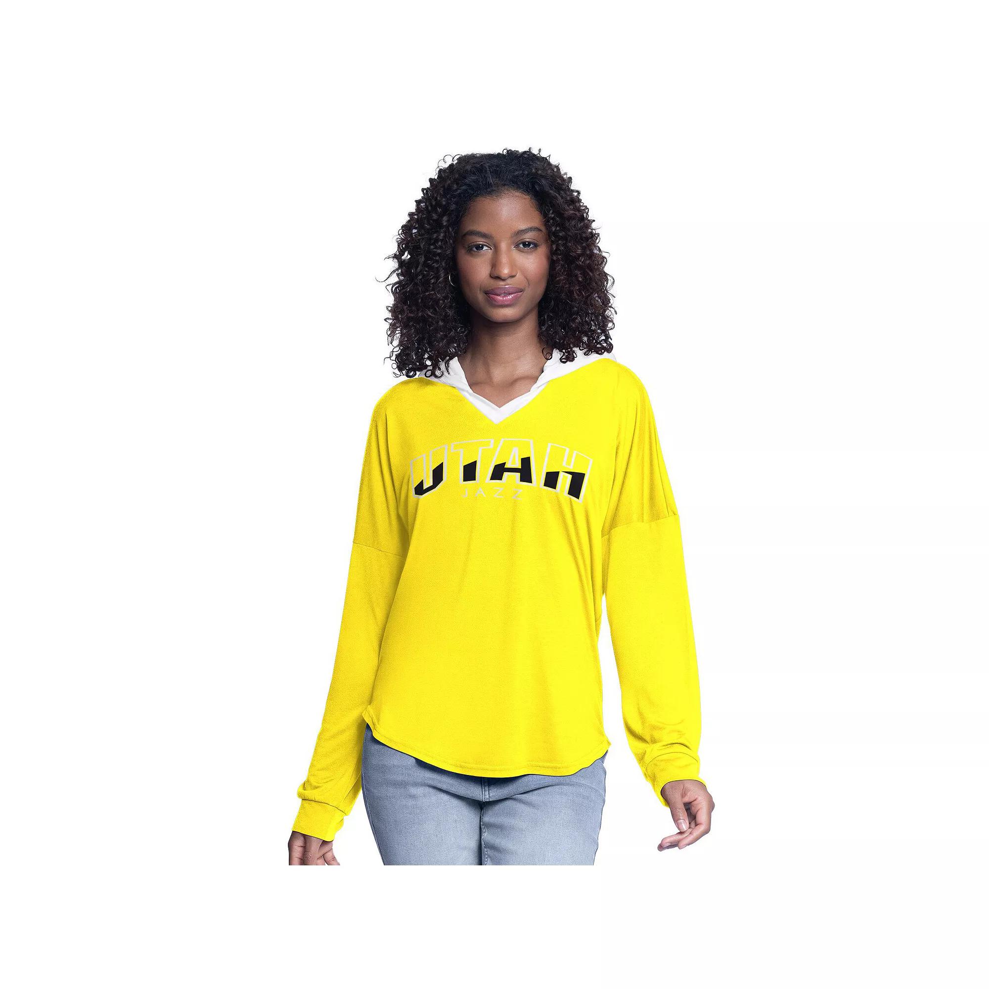 Embrace your Utah Jazz spirit in comfort with this G-III 4Her by Carl Banks Bench Player Oversized Long Sleeve Hooded Top. This oversized hooded top provides a relaxed fit, making it perfect for cheering on your favorite team on game day. A lightweight option, its crafted from soft cotton and durable polyester and provides a trendy look for any Utah Jazz fan.Embrace your Utah Jazz spirit in comfort with this G-III 4Her by Carl Banks Bench Player Oversized Long Sleeve Hooded Top. This oversized hooded top provides a relaxed fit, making it perfect for cheering on your favorite team on game day. A lightweight option, its crafted from soft cotton and durable polyester and provides a trendy look for any Utah Jazz fan.PRODUCT FEATURESV-neckLong sleeveLightweight feelOfficially licensedHoodedScreen print graphics on the frontMaterial: 60% Cotton/40% PolyesterDropped shoulder for a casual lookBrand: G-III 4Her by Carl BanksMachine wash, tumble dry lowRounded droptail hemImportedOversized, relaxed fitIntegrated hoodie without drawstring Size: XL. Color: Jaz Gold. Gender: female. Age Group: adult.