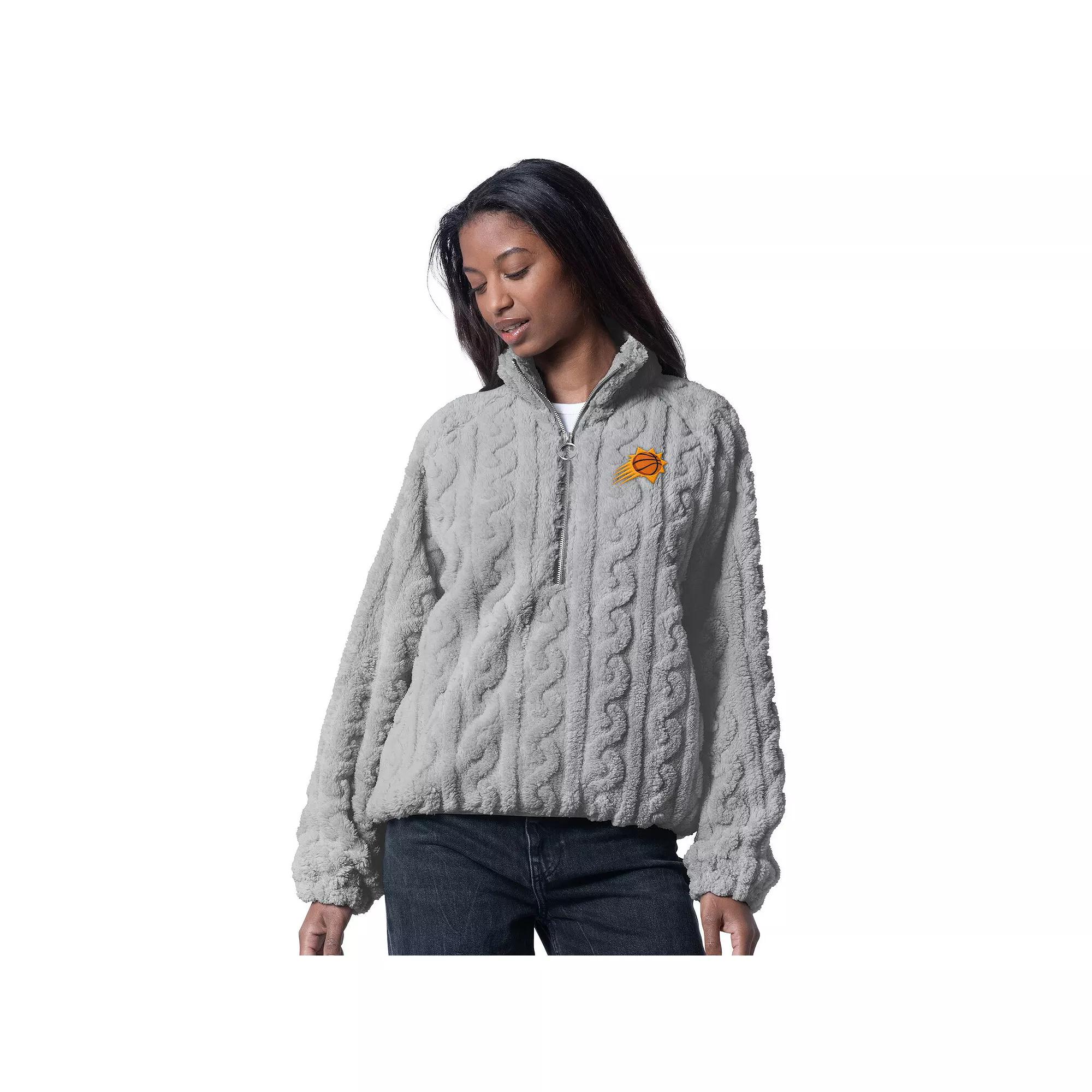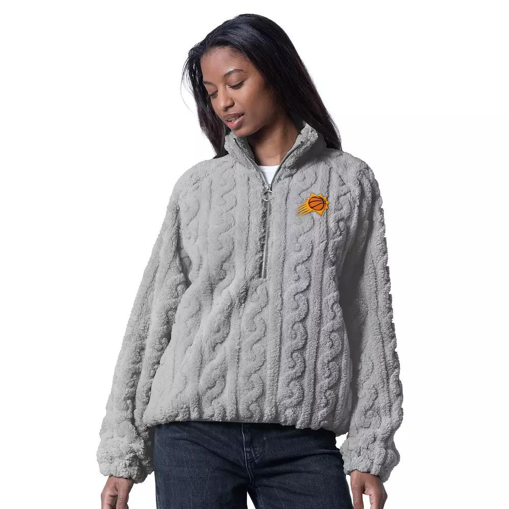 Show off your Phoenix Suns pride with this Champ Half-Zip Pullover from G-III 4Her by Carl Banks. This midweight pullover is perfect for moderate temperatures, offering a cozy layer without being too bulky. The tackle twill applique logo proudly displays your Phoenix Suns pride, while the two zippered side pockets add both style and functionality. Brand: G-III 4Her by Carl Banks. Material: 100% Polyester. Tackle twill applique logo at left front chest. Jacquard raised cable knit pattern. Sherpa fabric offers a luxurious soft feel and exceptional warmth. Officially licensed. Imported. Raglan sleeves for greater freedom of movement in the shoulders and arms. Mock neck for added warmth and comfort. 1/2-Zip. Elastic trim cuffs and waistband. Long sleeve. Metal ring pull tab at zip closure. Two side pockets. Midweight pullover suitable for moderate temperatures. Slightly cropped to sit at hip. Color: Phx Grey. Gender: female. Age Group: adult. Material: COTTON.