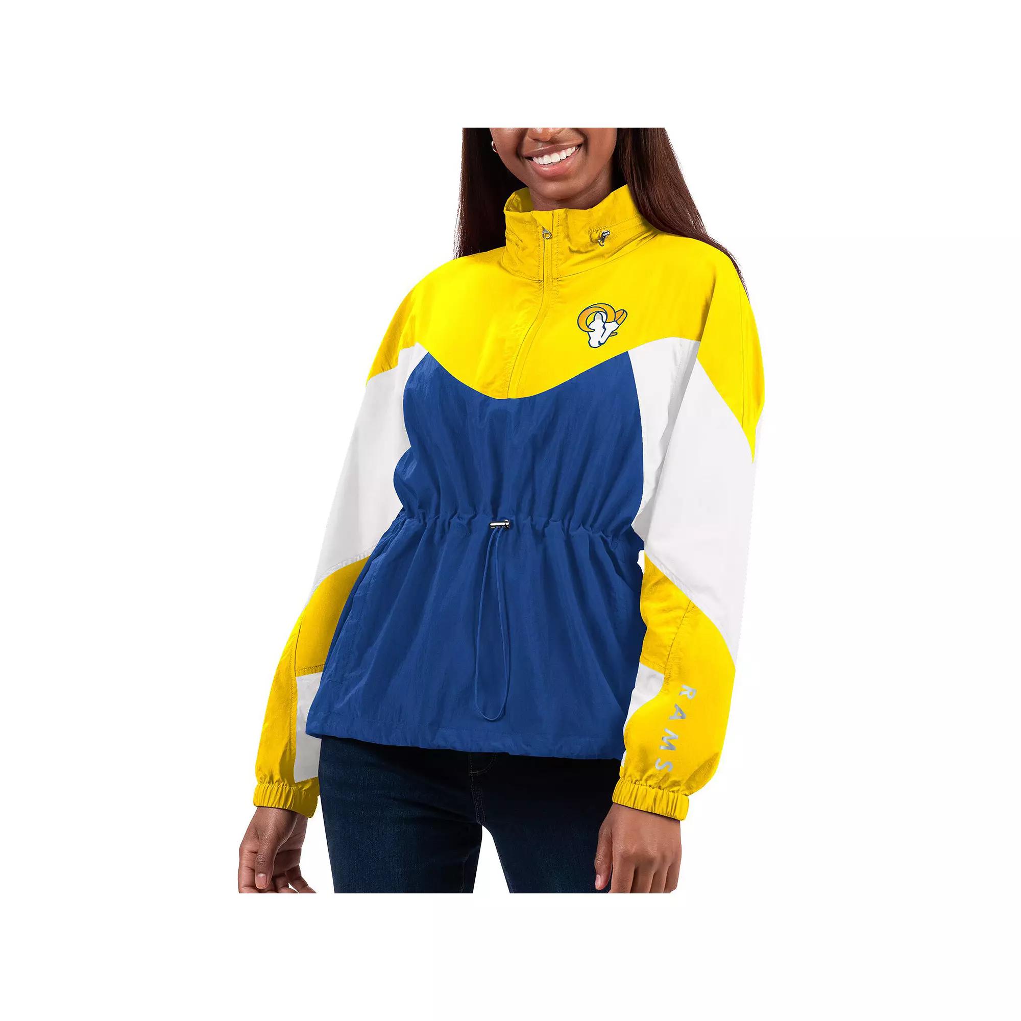 On those blustery days, let your Los Angeles Rams pride keep the wind at bay with this Tie Breaker jacket. This G-III 4Her by Carl Banks design includes a drawstring at the waist, a hood that packs into the mock neck collar and even two pockets, perfect for keeping hands warm or holding small necessities. The focal point is firmly on the Los Angeles Rams logo, backed up by the teams name printed on the left sleeve and the team-color fabric.
