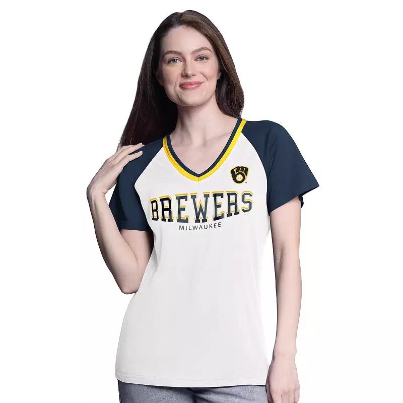 Enjoy a classic look with a touch of Milwaukee Brewers spirit in this G-III 4Her by Carl Banks Ball Park Raglan V-Neck T-Shirt. This stylish top features contrast-color raglan sleeves and a stripe design at the collar for a sporty, vintage-inspired aesthetic. Plus, the screen printed team wordmark and logo on the front let you show your Milwaukee Brewers pride.Enjoy a classic look with a touch of Milwaukee Brewers spirit in this G-III 4Her by Carl Banks Ball Park Raglan V-Neck T-Shirt. This stylish top features contrast-color raglan sleeves and a stripe design at the collar for a sporty, vintage-inspired aesthetic. Plus, the screen printed team wordmark and logo on the front let you show your Milwaukee Brewers pride.PRODUCT FEATURESScreen print graphicsOfficially licensedStripe design at neckScreen print team wordmark and logo with foil details on frontV-neckBrand: G-III 4Her by Carl BanksShort sleeveMaterial: 60% Cotton/40% PolyesterRaglan sleeves for greater freedom of movement in the shoulders and armsMachine wash with garment inside out, tumble dry lowImported Size: XS. Color: White. Gender: female. Age Group: adult.