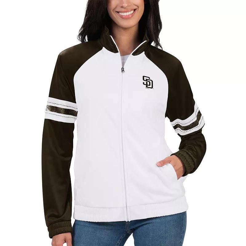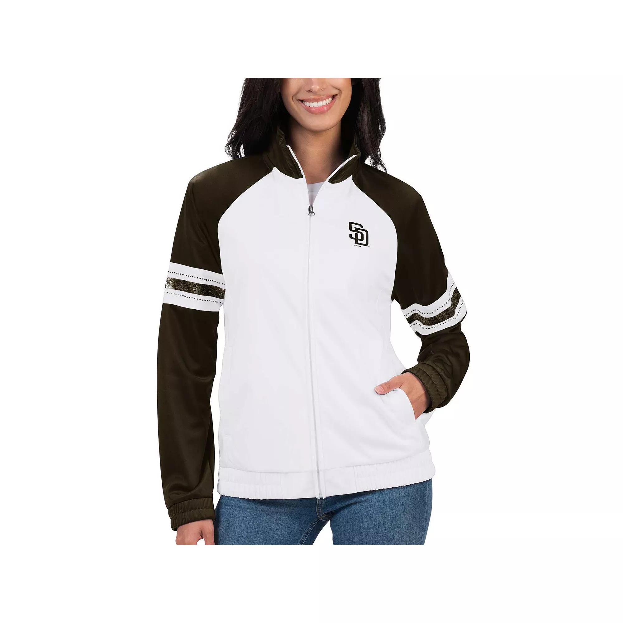 Be prepared for when temperatures start to drop with this San Diego Padres Show Up track jacket from G-III 4Her by Carl Banks. It features printed team graphics with eye-catching glitter details that let your love for your favorites shine and a stylish stand-up collar. This midweight full-zip is design with raglan sleeves that offer ease of movement and two front pocket for convenient storage, making it the perfect outer layer for chilly San Diego Padres game days.Be prepared for when temperatures start to drop with this San Diego Padres Show Up track jacket from G-III 4Her by Carl Banks. It features printed team graphics with eye-catching glitter details that let your love for your favorites shine and a stylish stand-up collar. This midweight full-zip is design with raglan sleeves that offer ease of movement and two front pocket for convenient storage, making it the perfect outer layer for chilly San Diego Padres game days.PRODUCT FEATURESOfficially licensedMaterial: 100% PolyesterFull ZipLong sleeveStand-up collarTwo front pocketsScreen print graphicsImportedRaglan sleevesBrand: G-III 4Her by Carl BanksMidweight jacket suitable for moderate temperaturesElastic cuffsGlitter details on back and sleeves Color: White. Gender: female. Age Group: adult.