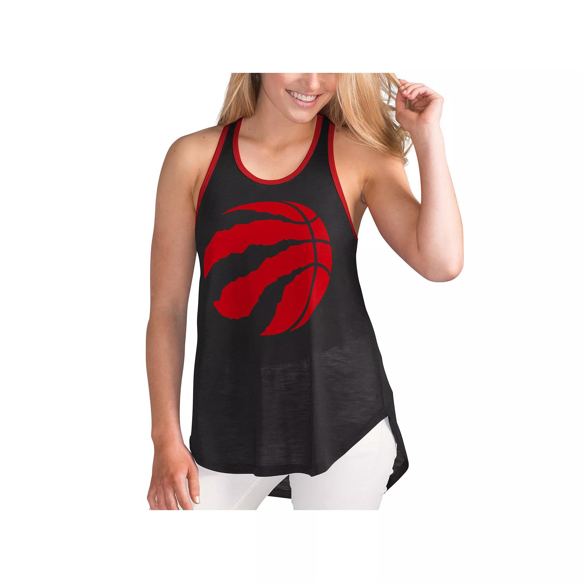 Feel the breeze in this chic Toronto Raptors Showdown tank top from G-III Sports by Carl Banks. This racerback features a scoop neck and burnout fabric. Best of all, the striking Toronto Raptors graphics effortlessly highlight your fandom.Feel the breeze in this chic Toronto Raptors Showdown tank top from G-III Sports by Carl Banks. This racerback features a scoop neck and burnout fabric. Best of all, the striking Toronto Raptors graphics effortlessly highlight your fandom.PRODUCT FEATURESImportedBrand: G-III Sports by Carl BanksOfficially licensedBurnout designMaterial: 100% PolyesterScoop neckRacerbackMachine wash with garment inside out, tumble dry lowRounded droptail hemScreen print graphics Color: RPT BLACK. Gender: female. Age Group: adult. Material: COTTON.