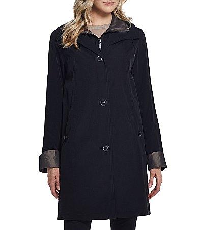 From Gallery, this coat features:Water resistant fabricationStand collarSet-in sleevesDetachable hoodSide entry pocketsInterior silk bibDetachable acrylic linerStraight hemlineZip and button front closureApprox. 36.5 lengthPolyesterMachine wash/tumble dryImported.