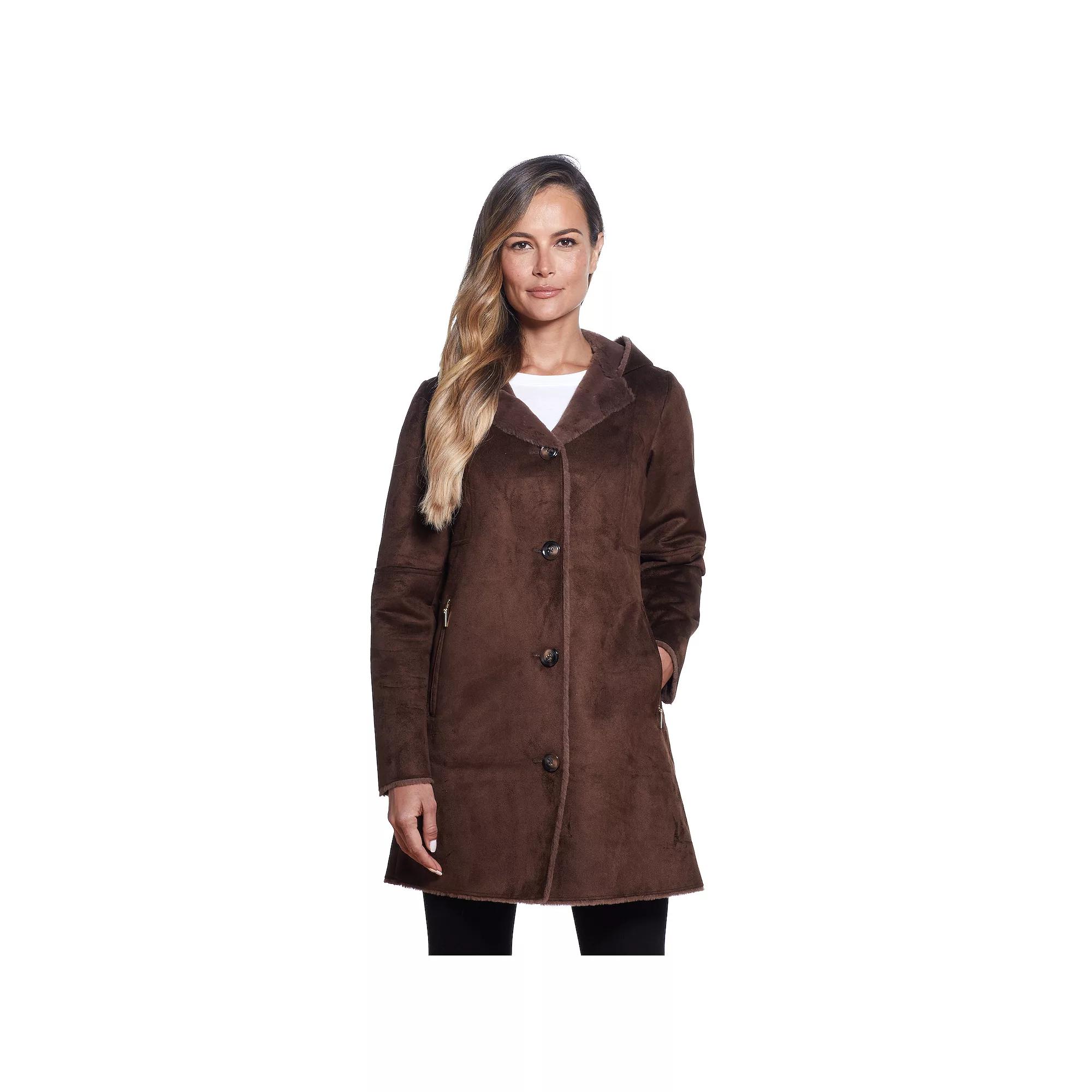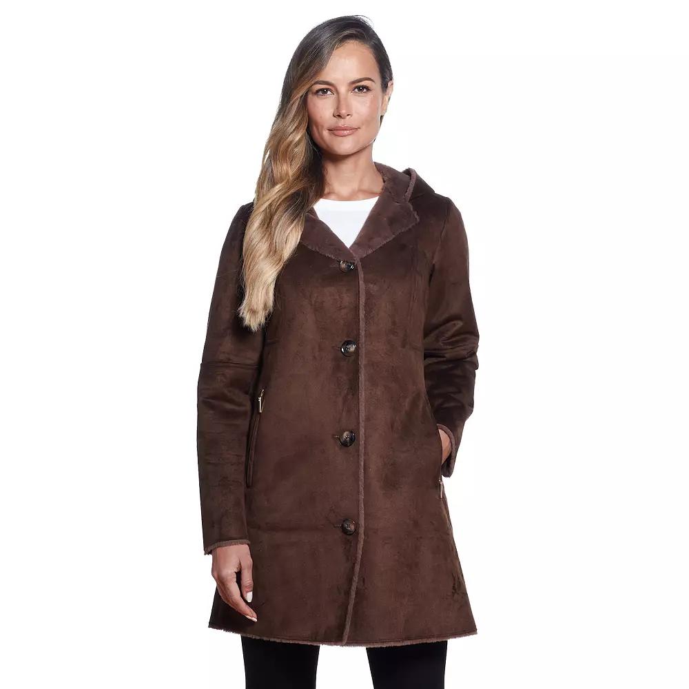 For a luxe winter look, reach for this womens faux-suede coat by Gallery.Finding the perfect fit and size for womens clothing requires basic measurements of your chest, waist, hips and inseam. Use this guide to learn more about sizing and everything Kohls has to offer in womens fashion. Attached hood with faux-shearling lining Button front Long sleeves Faux-suede construction 2 pocketsFIT & SIZING Designed to hit above the knees HeavyweightFABRIC & CARE Polyester Lining: polyester Machine wash - Delicate Imported Size: Medium. Color: Brown. Gender: female. Age Group: adult. Material: Faux Suede.