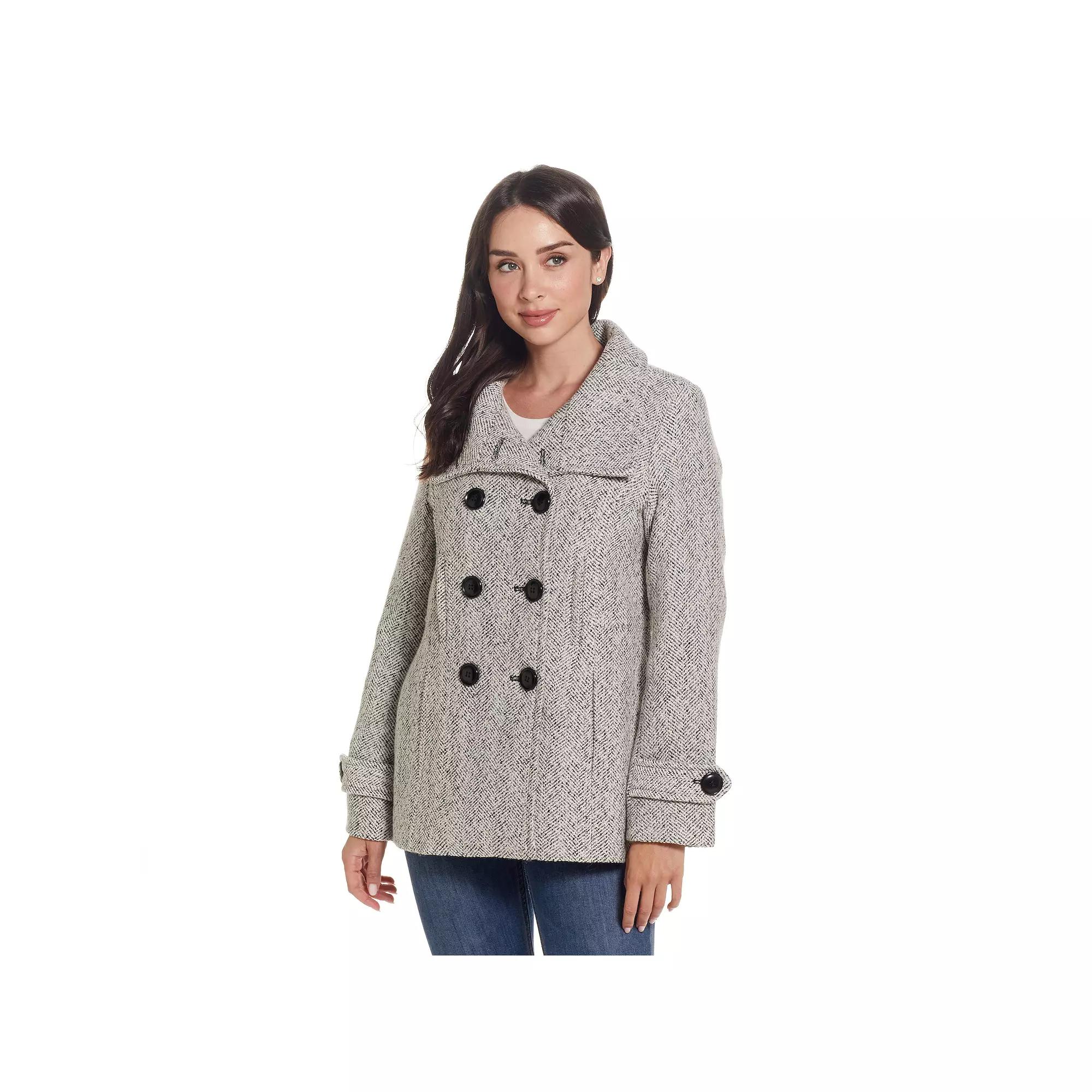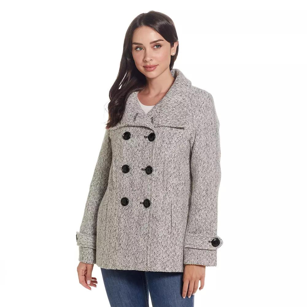 From Gallery, this coat features:Herringbone printStand collar necklineLong sleevesDouble breastedSide entry pocketsHeavy weightWater resistantStraight hemlineButton front closureApprox. 30.5 lengthshell: polyester/wool; lining: polyesterDry cleanImported.