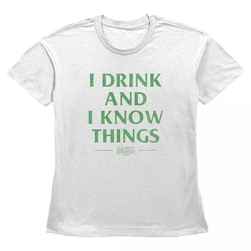 She'll love celebrating St. Patrick's Day in this Women's Game Of Thrones I Drink And I Know Things Graphic Tee.FEATURES Crewneck Short sleevesFABRIC & CARE Cotton Machine wash Imported Size: Large. Color: White. Gender: female. Age Group: adult.