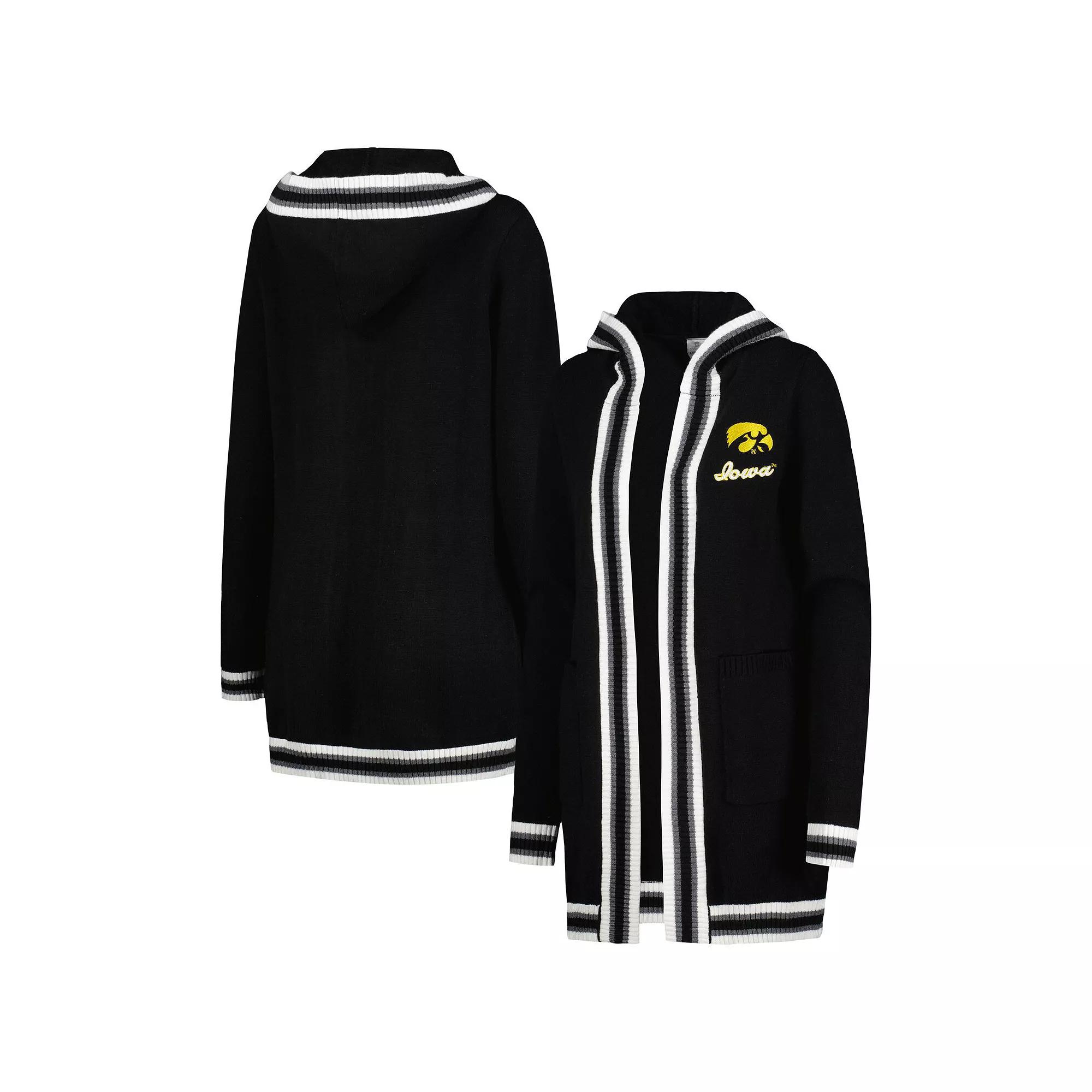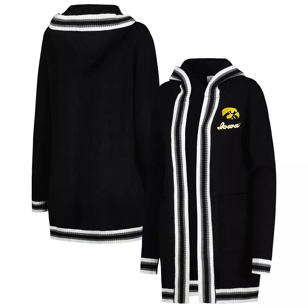 This Gameday Couture One More Round cardigan sweater is the perfect layer to sport on chilly game days. An understated Iowa Hawkeyes logo is enhanced by bold stripes for an eye-catching design. Plush tri-blend fabric and a midweight construction keep you nice and comfy. Pullover. Material: 50% Rayon/25% Nylon/25% Polyester. Hooded. Machine wash, dry flat. Long sleeve. Imported. Officially licensed. Brand: Gameday Couture. Midweight sweater suitable for moderate temperatures. Two front pockets. Embroidered graphics. Color: Black. Gender: female. Age Group: adult. Material: COTTON.