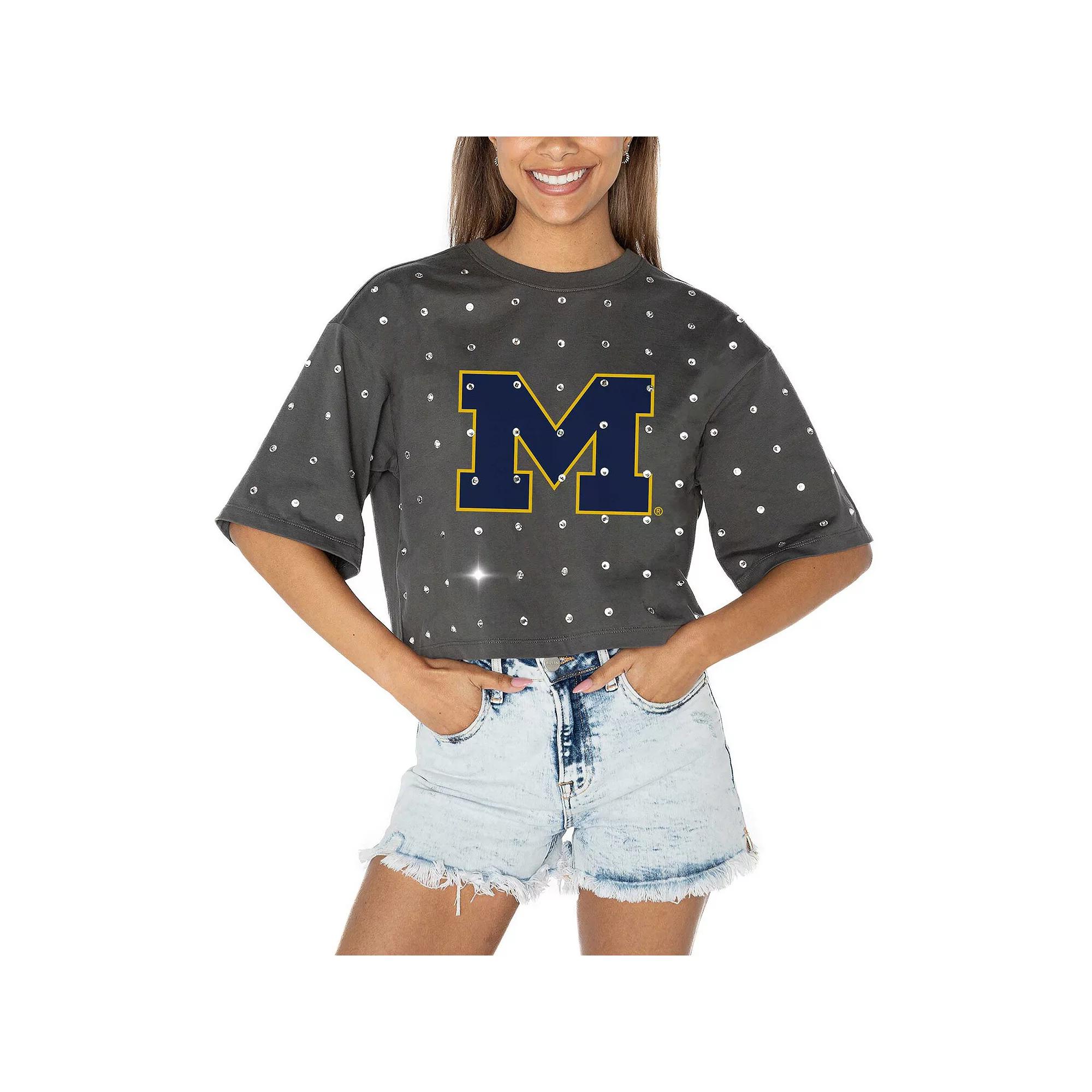 Get ready to cheer on the Michigan Wolverines with this sparkly and spirited Go Time Rhinestone Crop T-Shirt from Gameday Couture. Its mid-length crop design offers a flattering and trendy look, perfect for showcasing your game day style. The 100% cotton construction ensures a soft and breathable feel, keeping you comfortable all day long.Get ready to cheer on the Michigan Wolverines with this sparkly and spirited Go Time Rhinestone Crop T-Shirt from Gameday Couture. Its mid-length crop design offers a flattering and trendy look, perfect for showcasing your game day style. The 100% cotton construction ensures a soft and breathable feel, keeping you comfortable all day long.PRODUCT FEATURESOfficially licensedMid-length cropImportedMachine washBrand: Gameday CoutureShort sleeveScreen print graphicsRhinestone embellishment alloverMaterial: 100% Cotton Color: Grey. Gender: female. Age Group: adult.