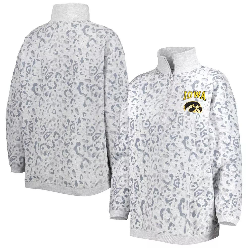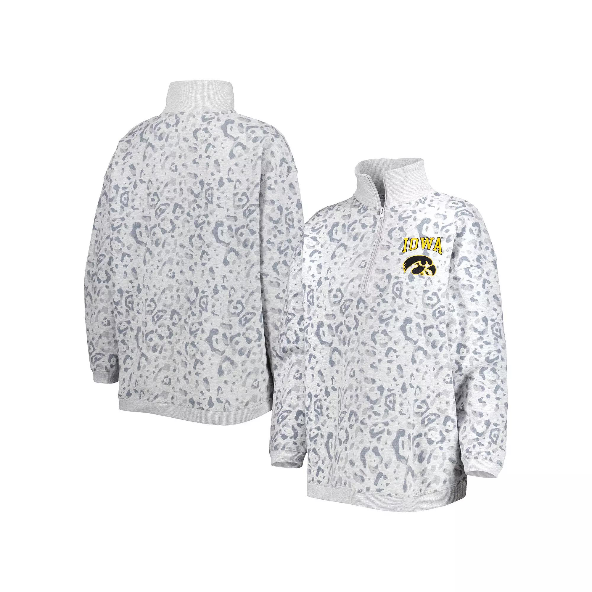 A perfect combination of style and team spirit, this Gameday Couture quarter-zip sweatshirt is sure to stand out in your Iowa Hawkeyes gear. The allover leopard design offers a unique twist, making it a fitting focal point in any game day ensemble. Plus, embroidered Iowa Hawkeyes graphics ensure everyone knows where your loyalty lies, while fleece lining offers added comfort when it's time to layer up. Olympic collar. Machine wash, tumble dry low. 1/4-Zip. Officially licensed. Brand: Gameday Couture. Embroidered graphics. Imported. Material: 65% Polyester/35% Cotton. Midweight sweatshirt suitable for moderate temperatures. Long sleeve. Fleece lining. 1/4-Zip. Color: Grey. Gender: female. Age Group: adult.